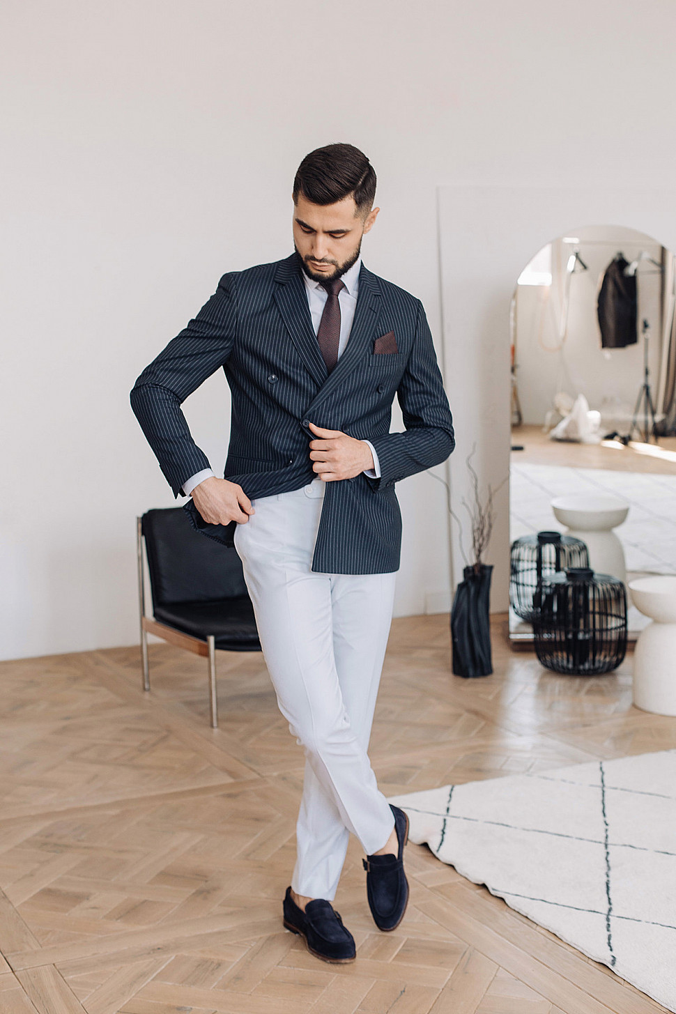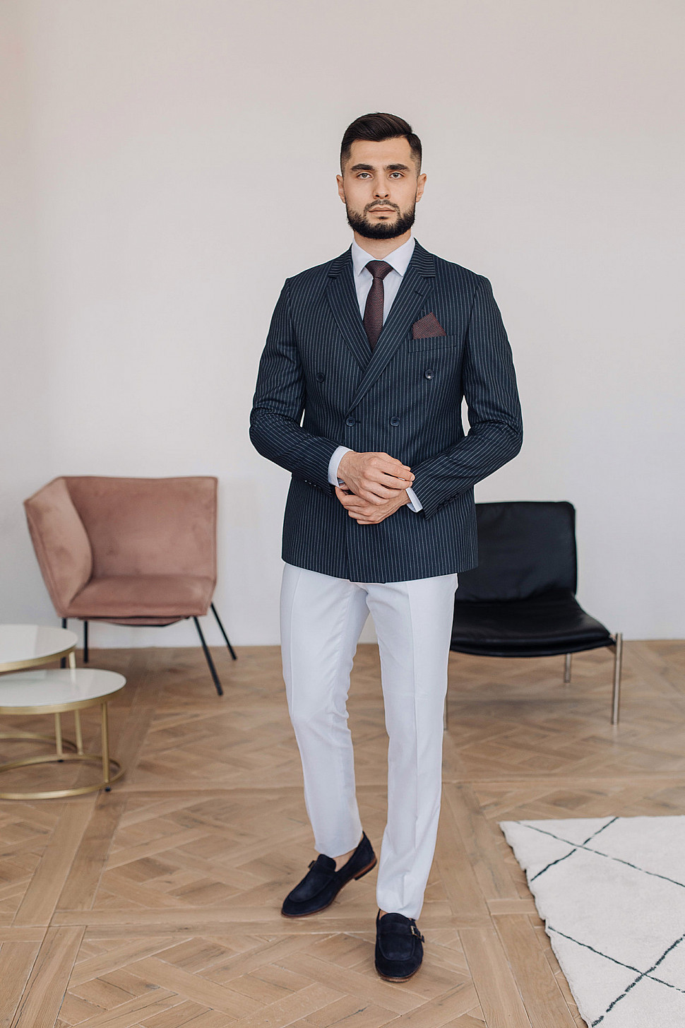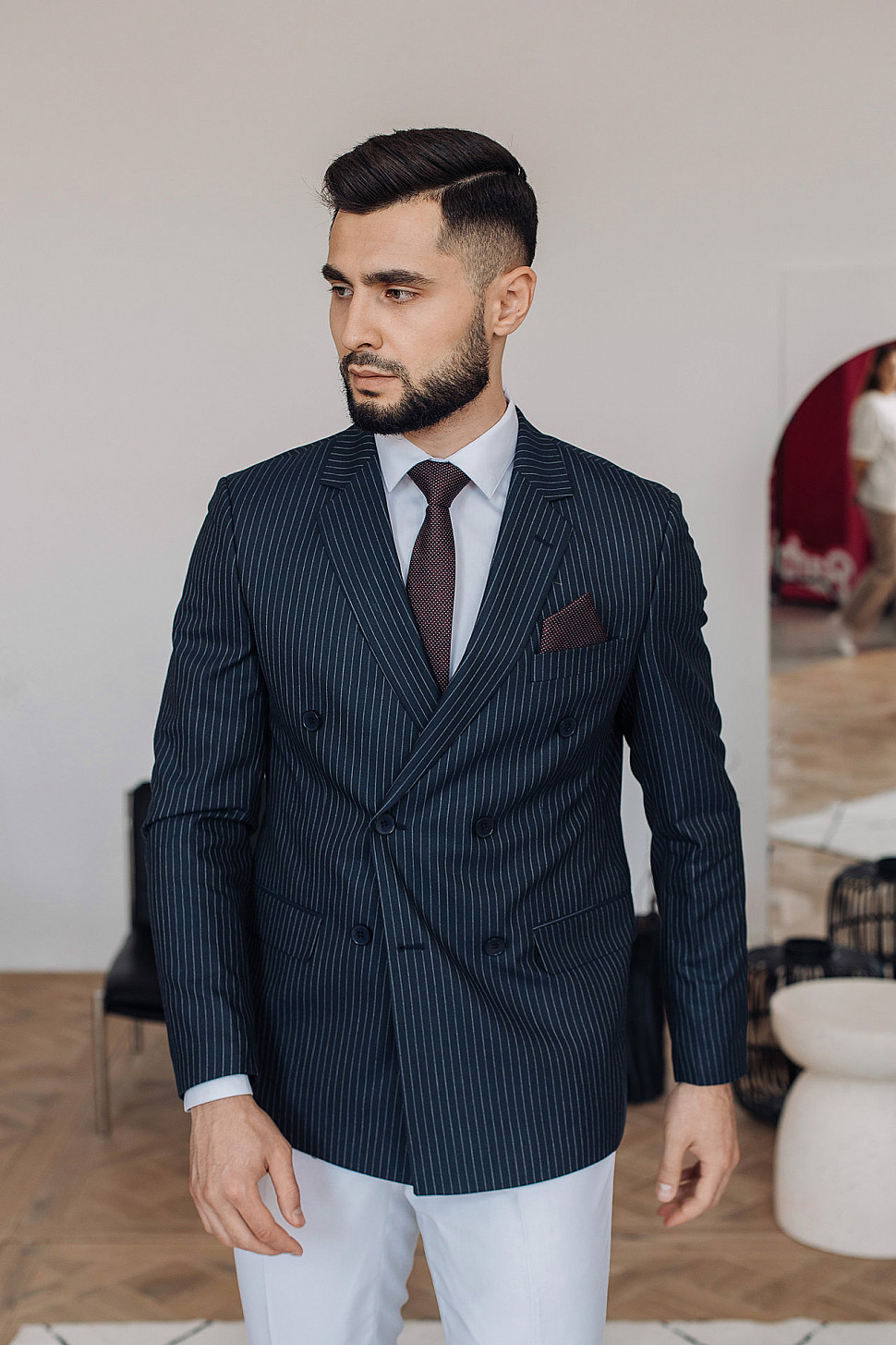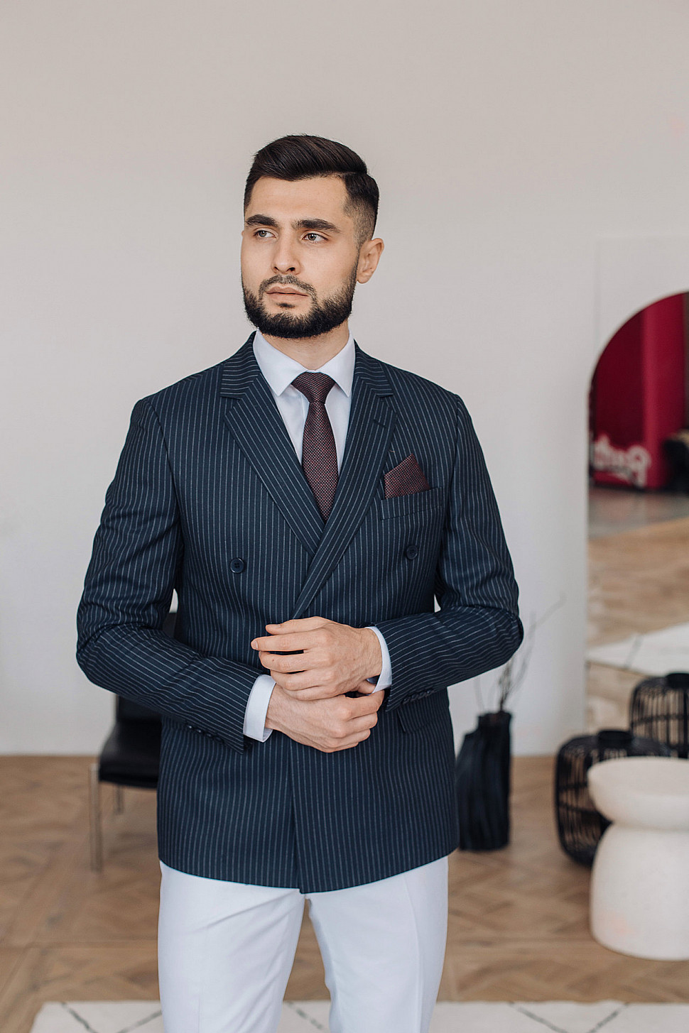 Костюм мужской двойка темно-синего цвета двубортный в полоску