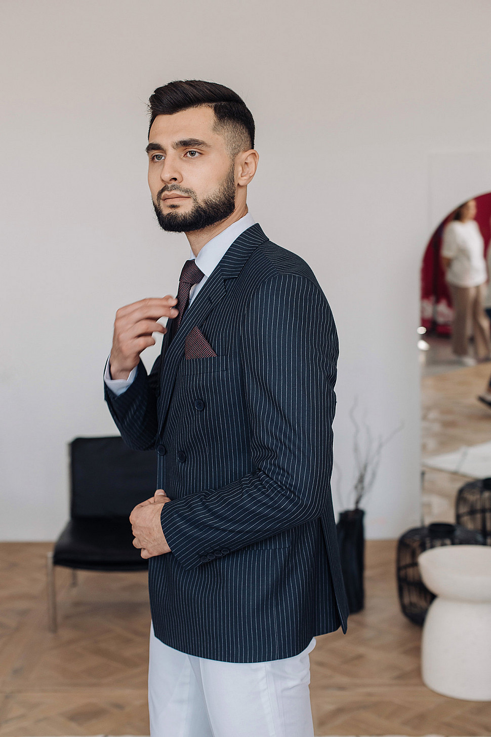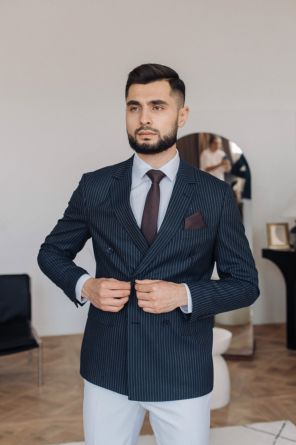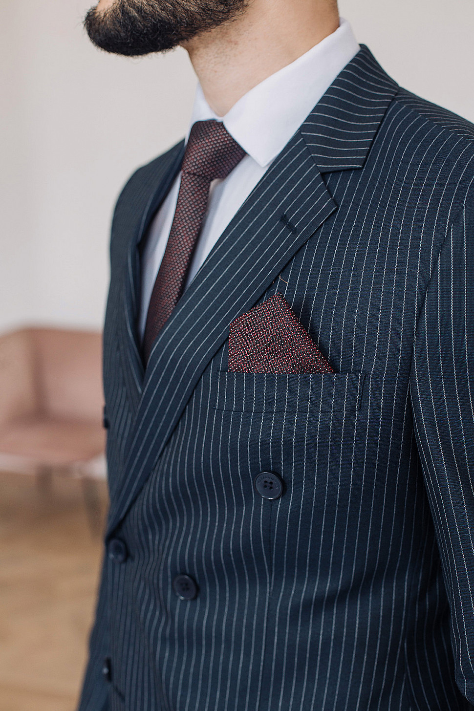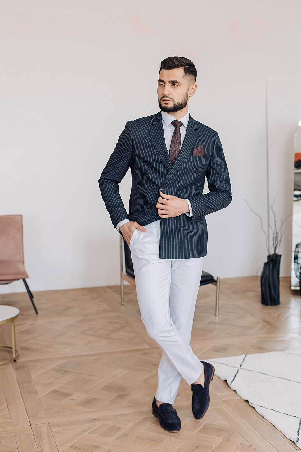Костюм мужской двойка темно-синего цвета двубортный в полоску