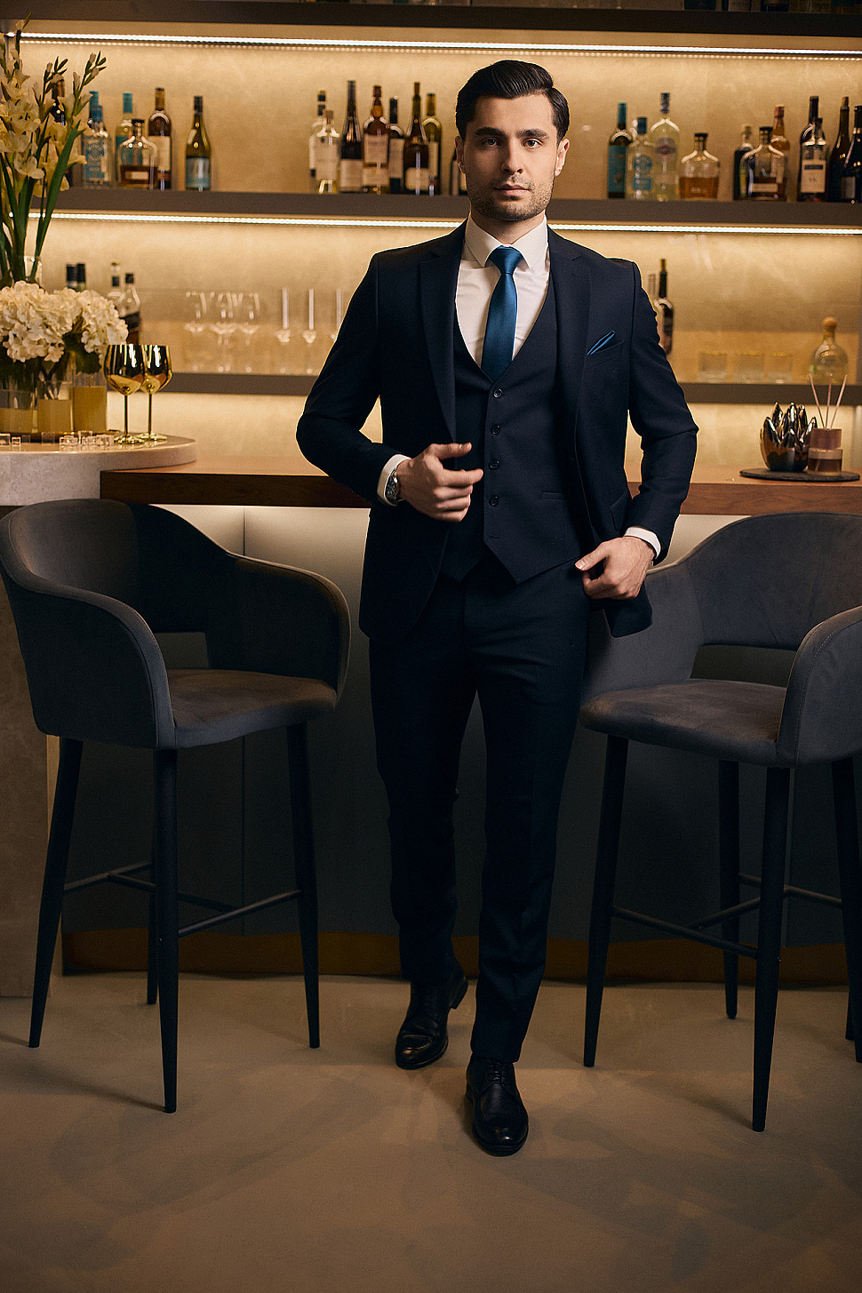 Мужской костюм тройка темно-синего цвета текстурный