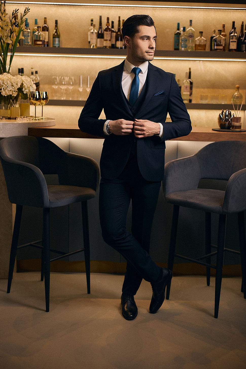Мужской костюм двойка темно-синий двубортный с золотыми пуговицами