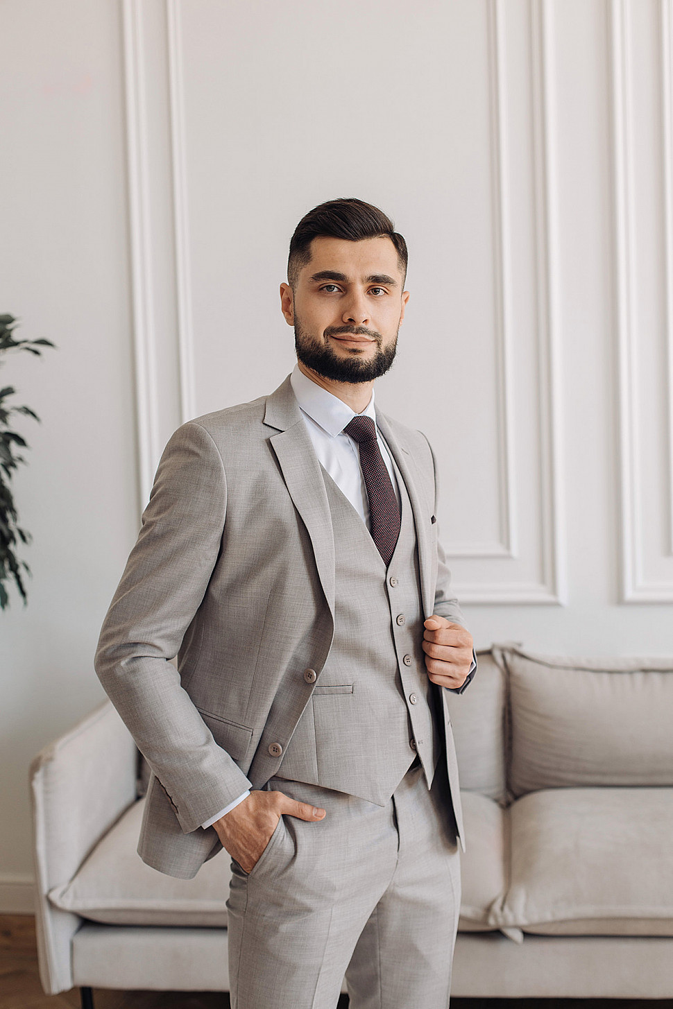 Мужской костюм двойка серый двубортный с золотыми пуговицами