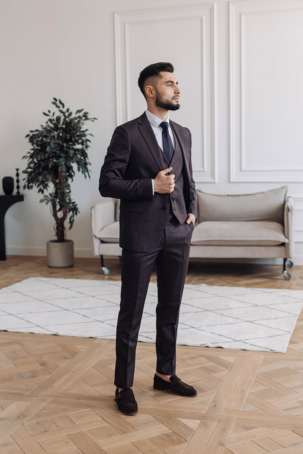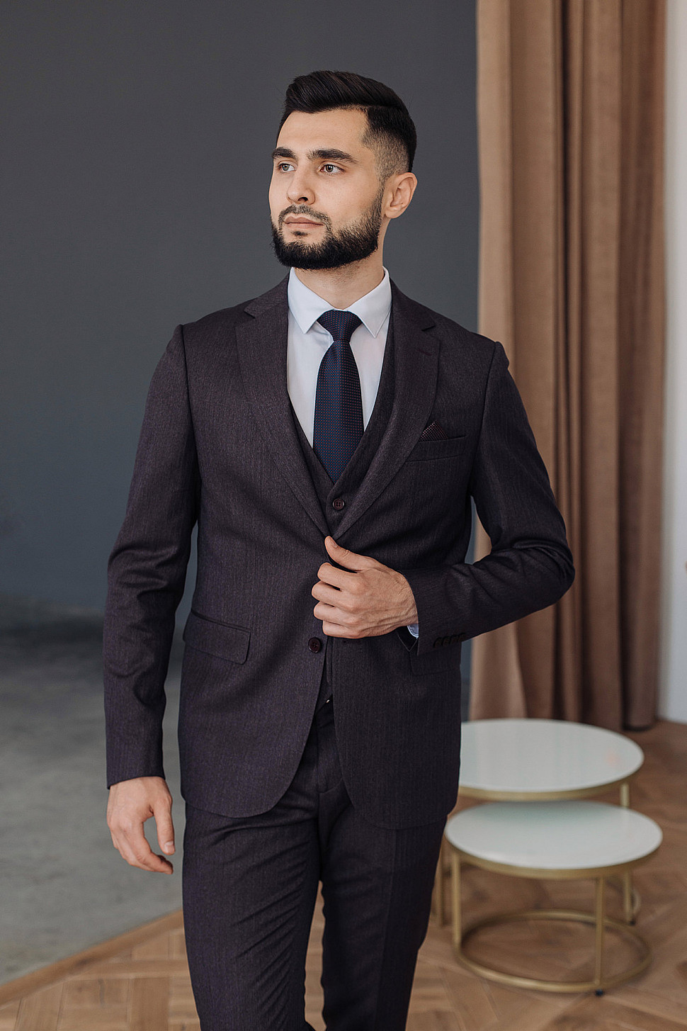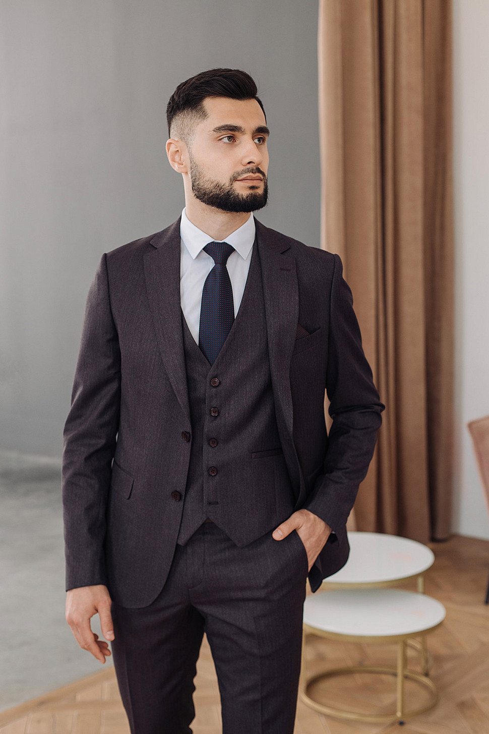 Мужской костюм тройка темно-фиолетового цвета фактурный