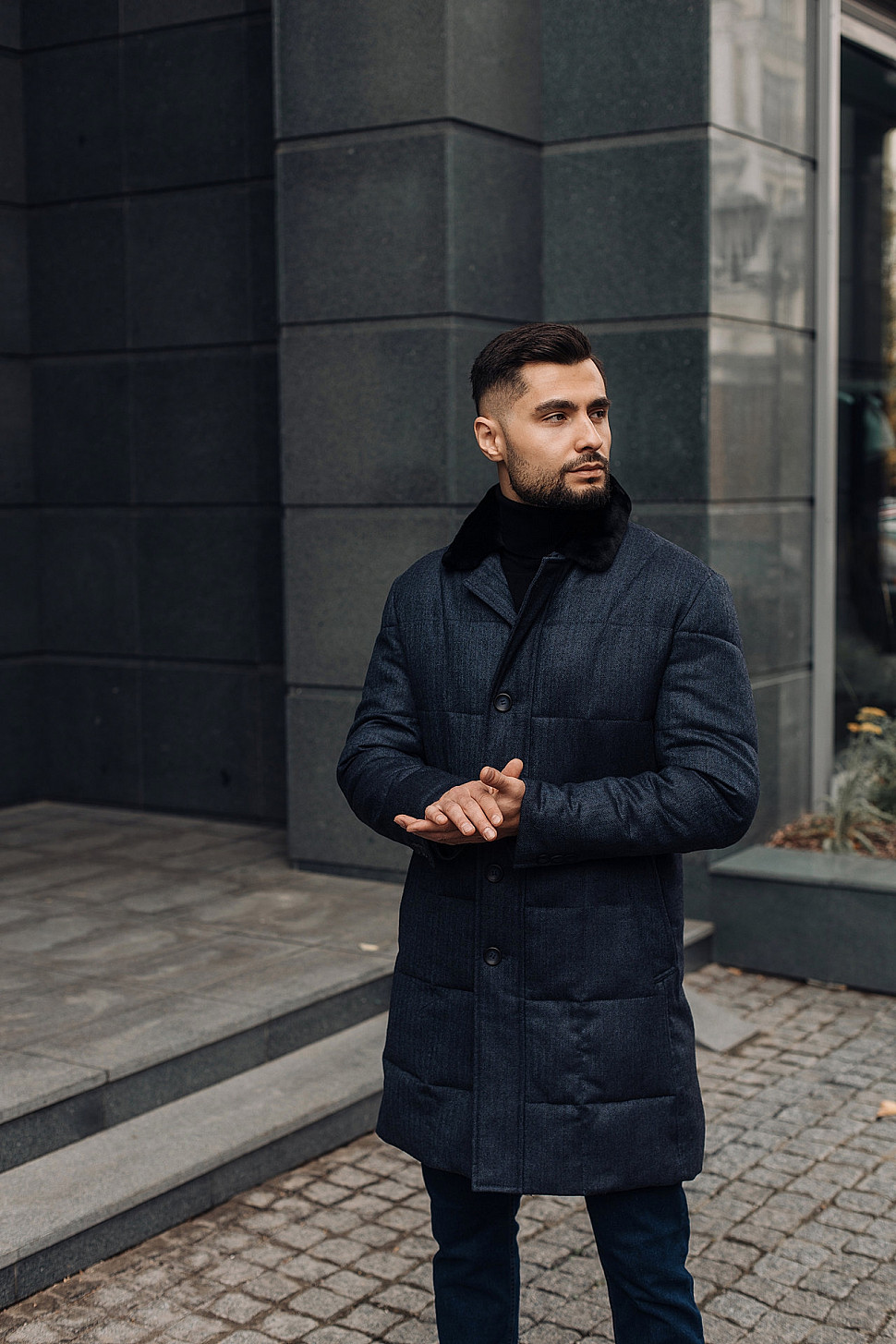Мужская куртка темно-синего цвета с меховым воротником