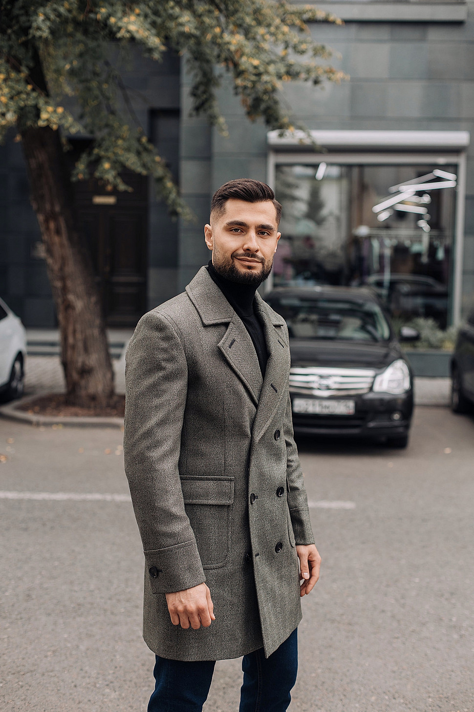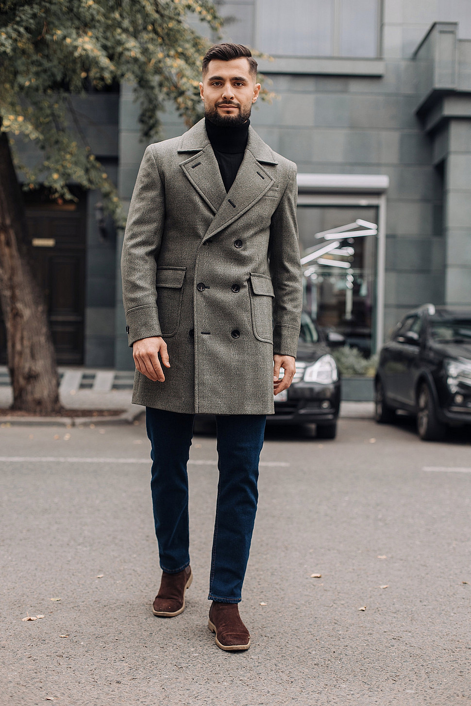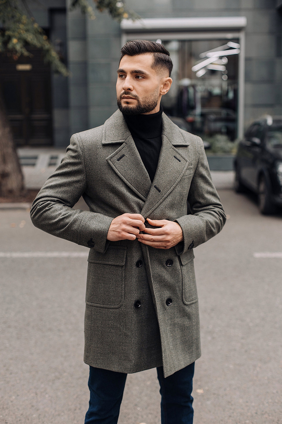 Мужское пальто черного цвета двубортное