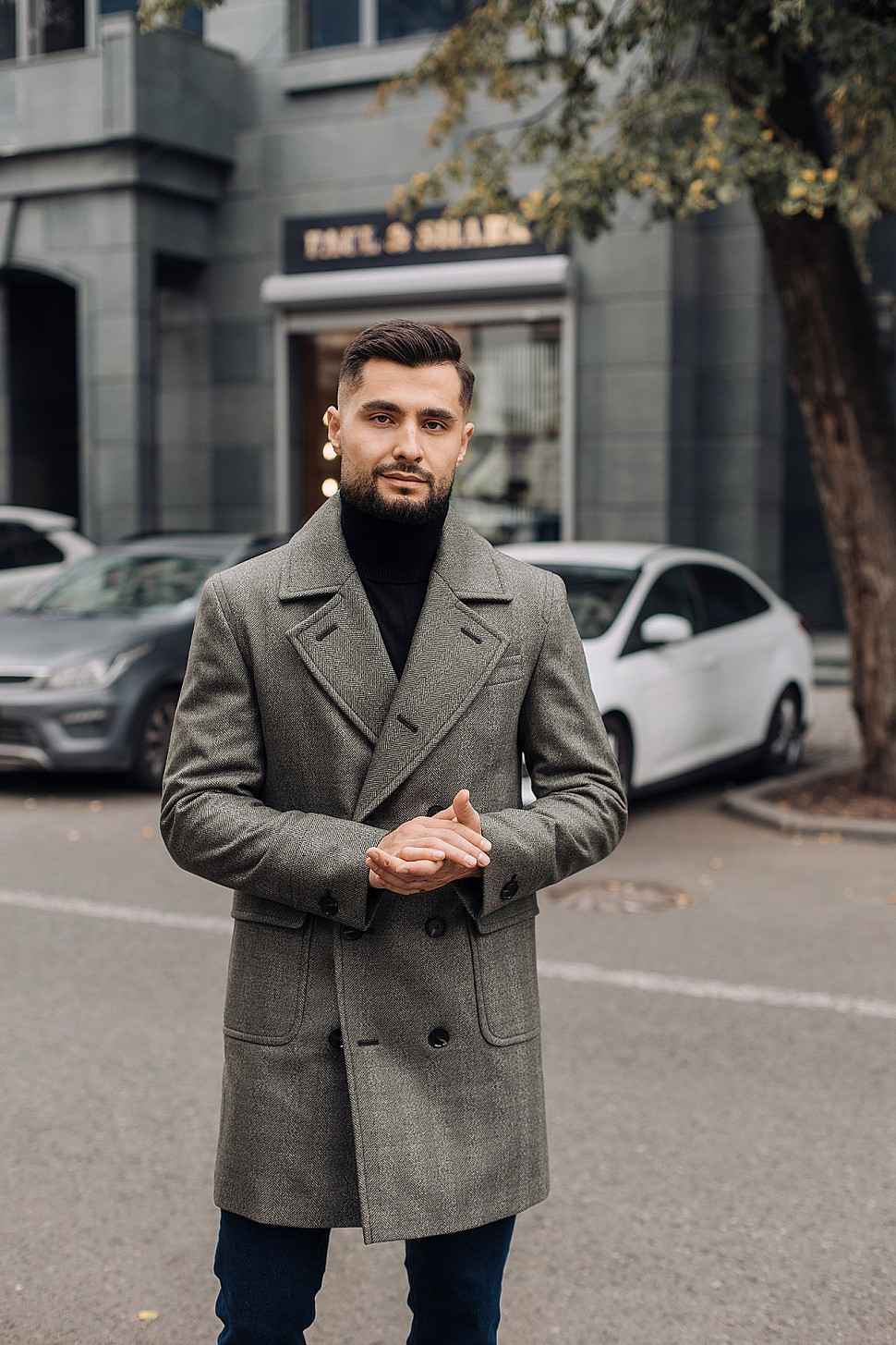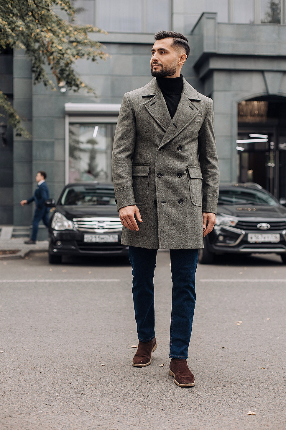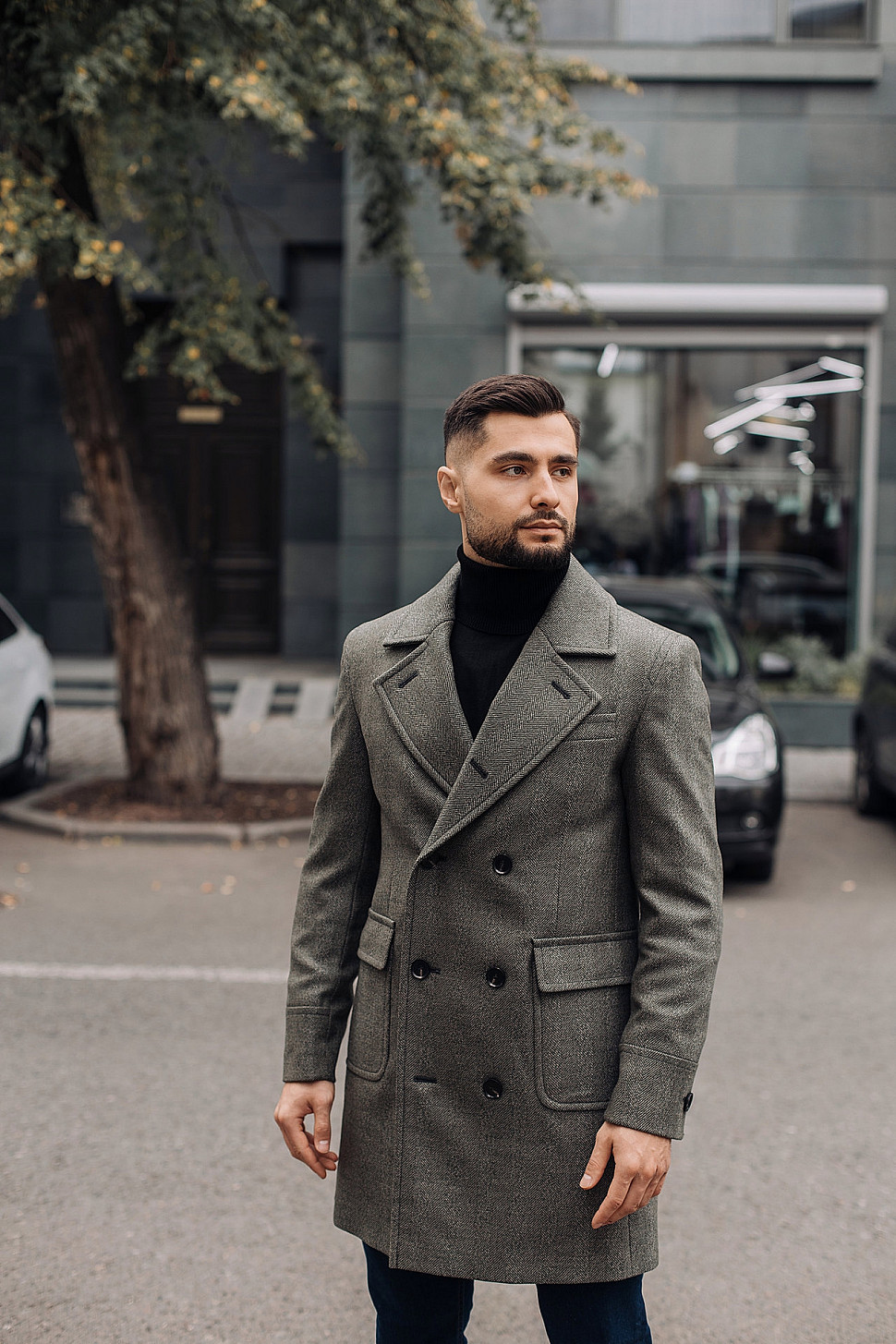 Мужское пальто черного цвета двубортное