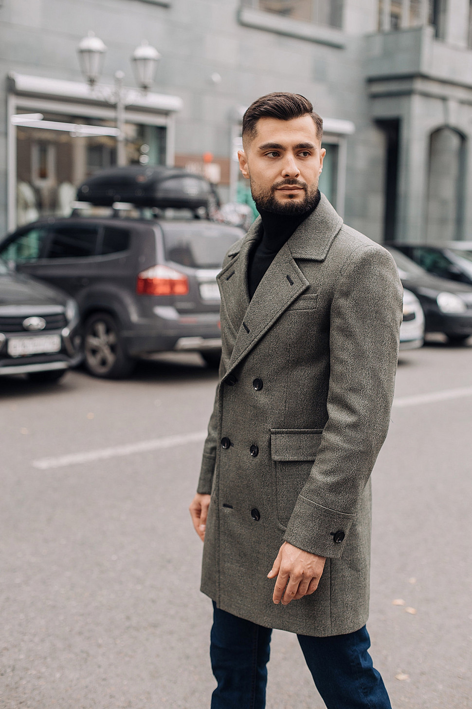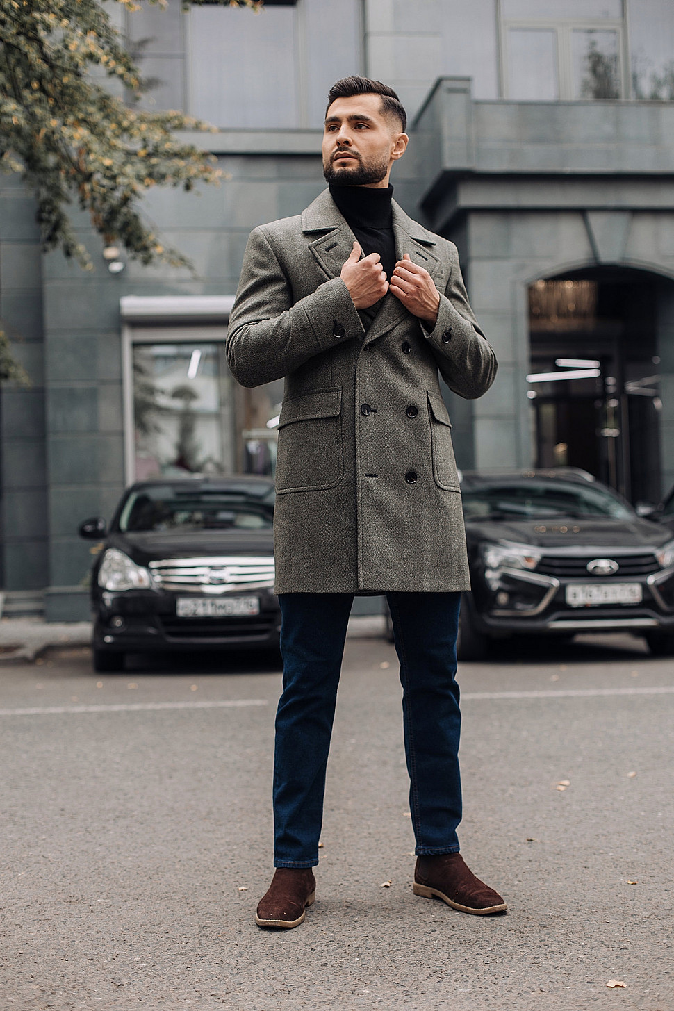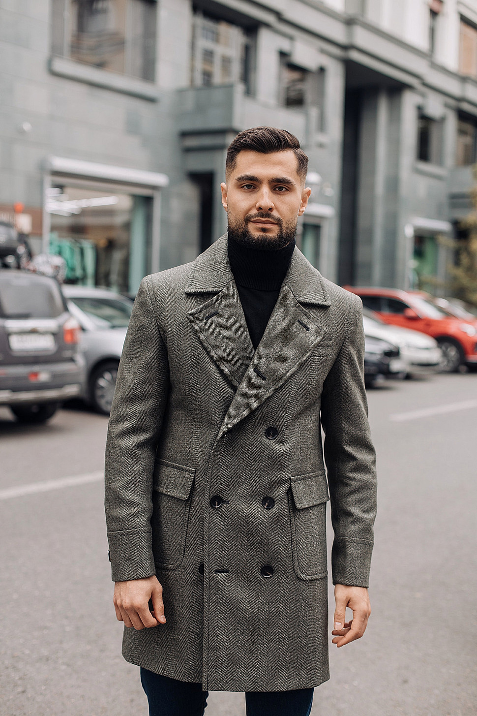 Мужское пальто серого цвета двубортное