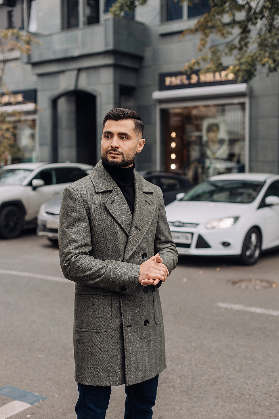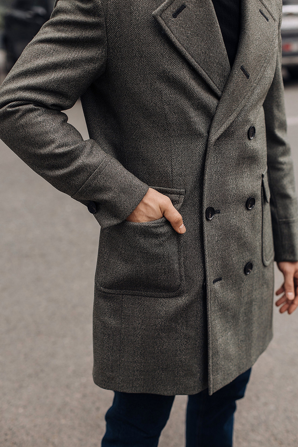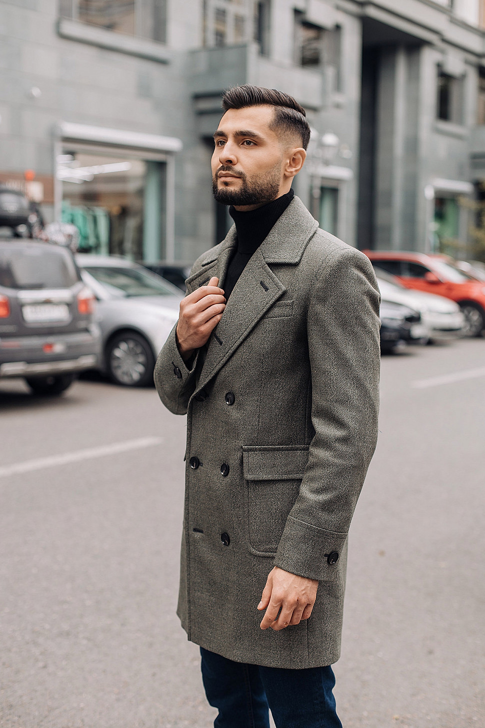 Мужское пальто серого цвета двубортное