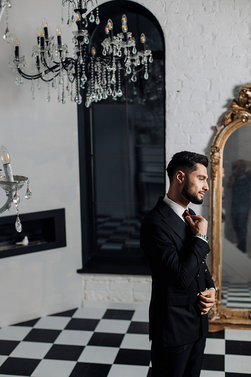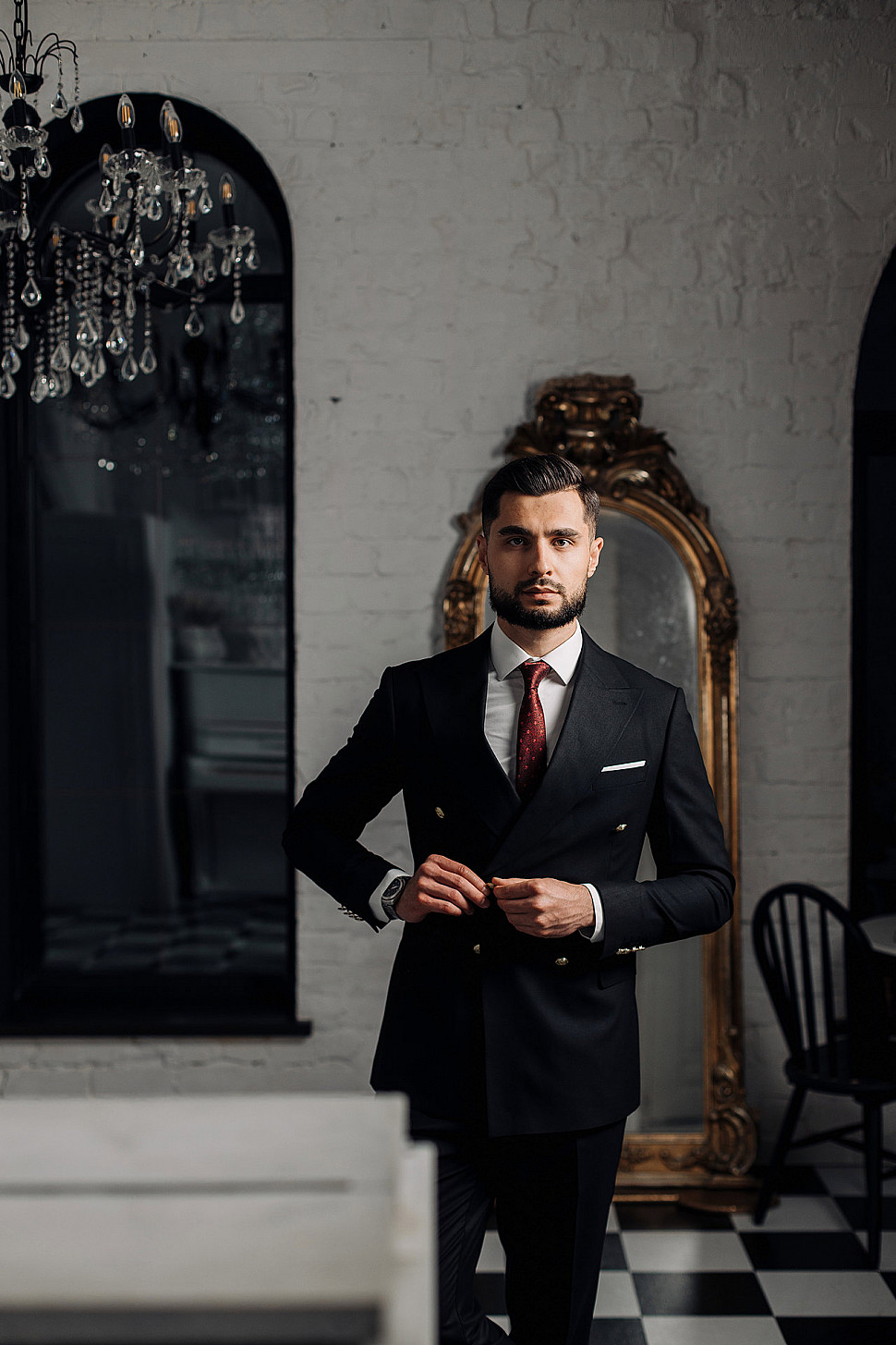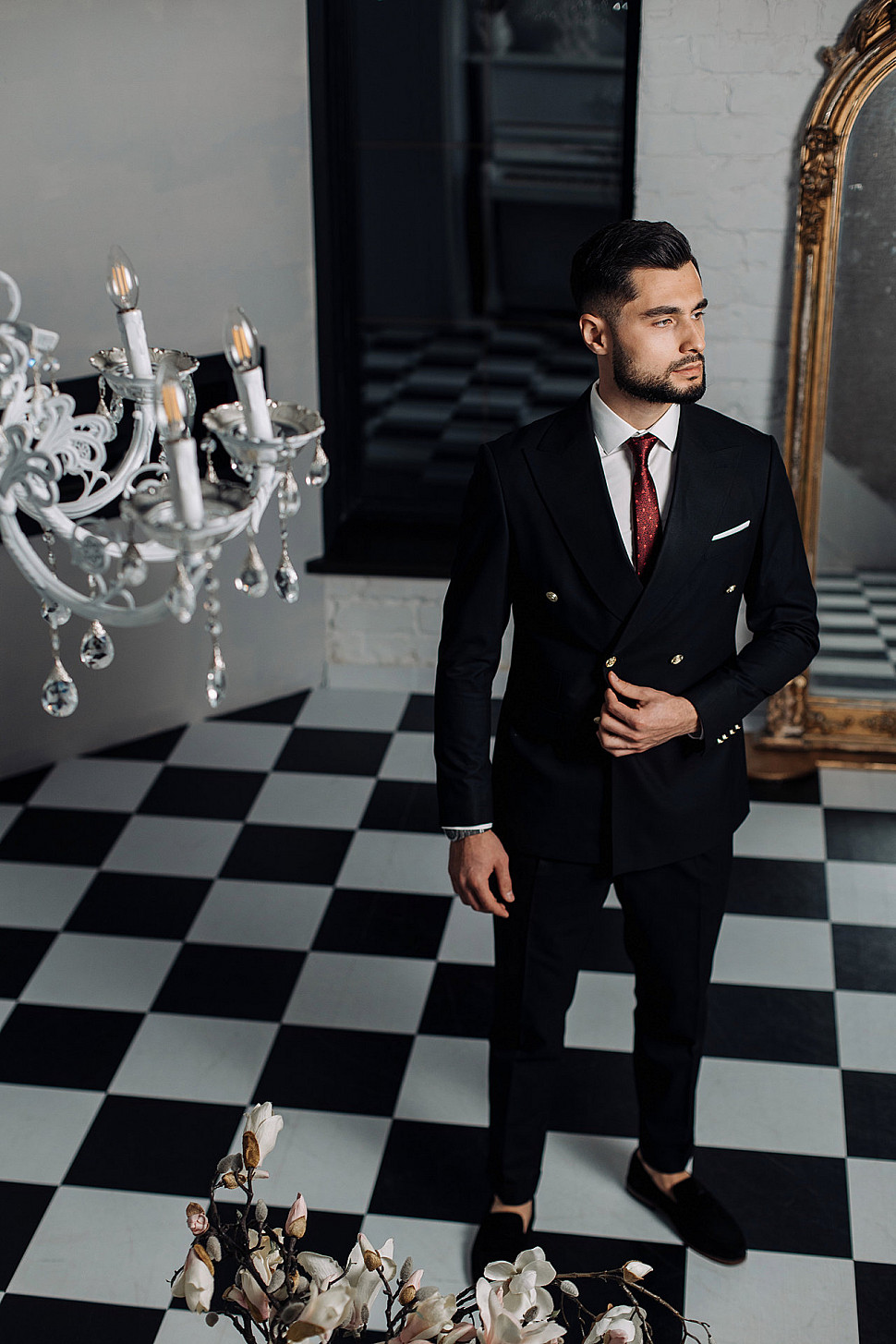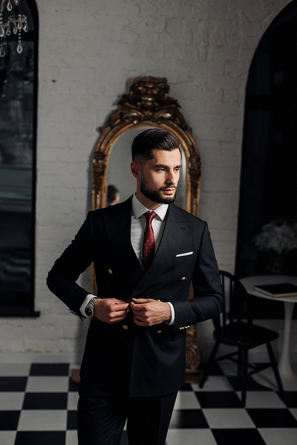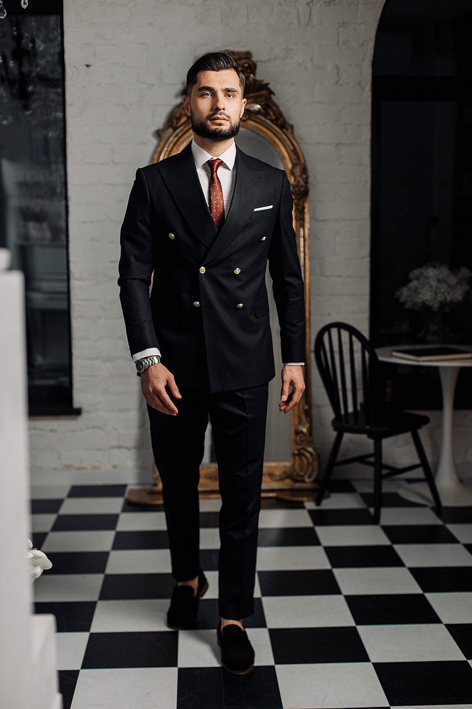 Мужской костюм тройка черного цвета и сноуборд