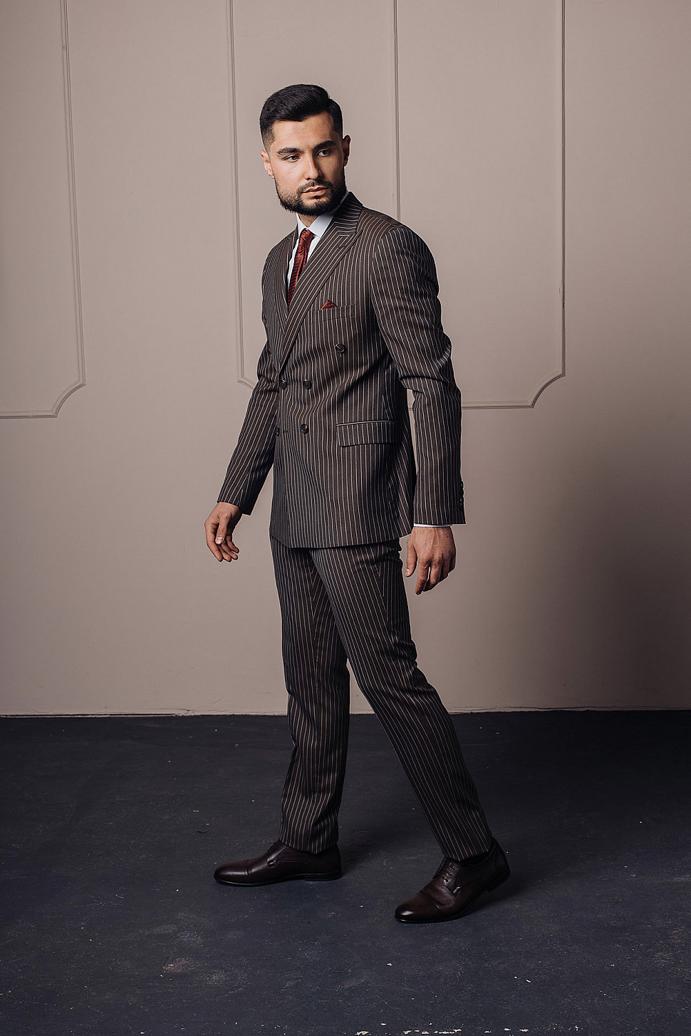 Мужской костюм двойка коричневого цвета в полоску двубортный