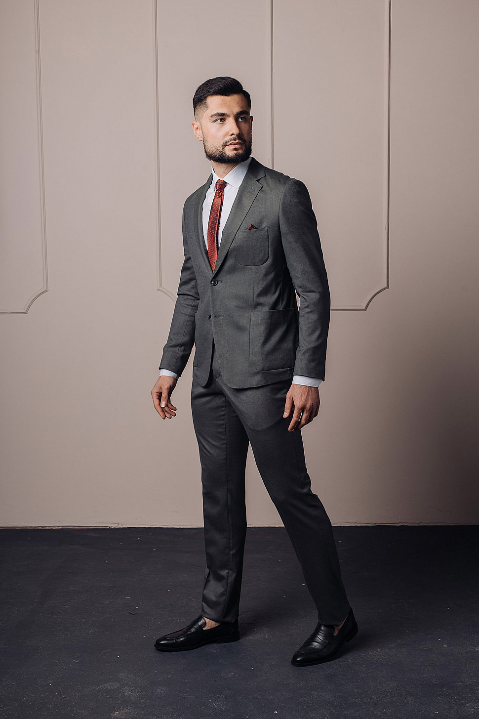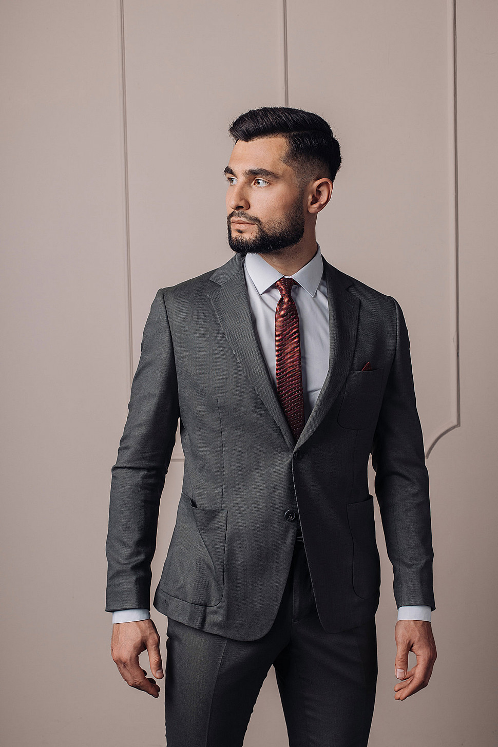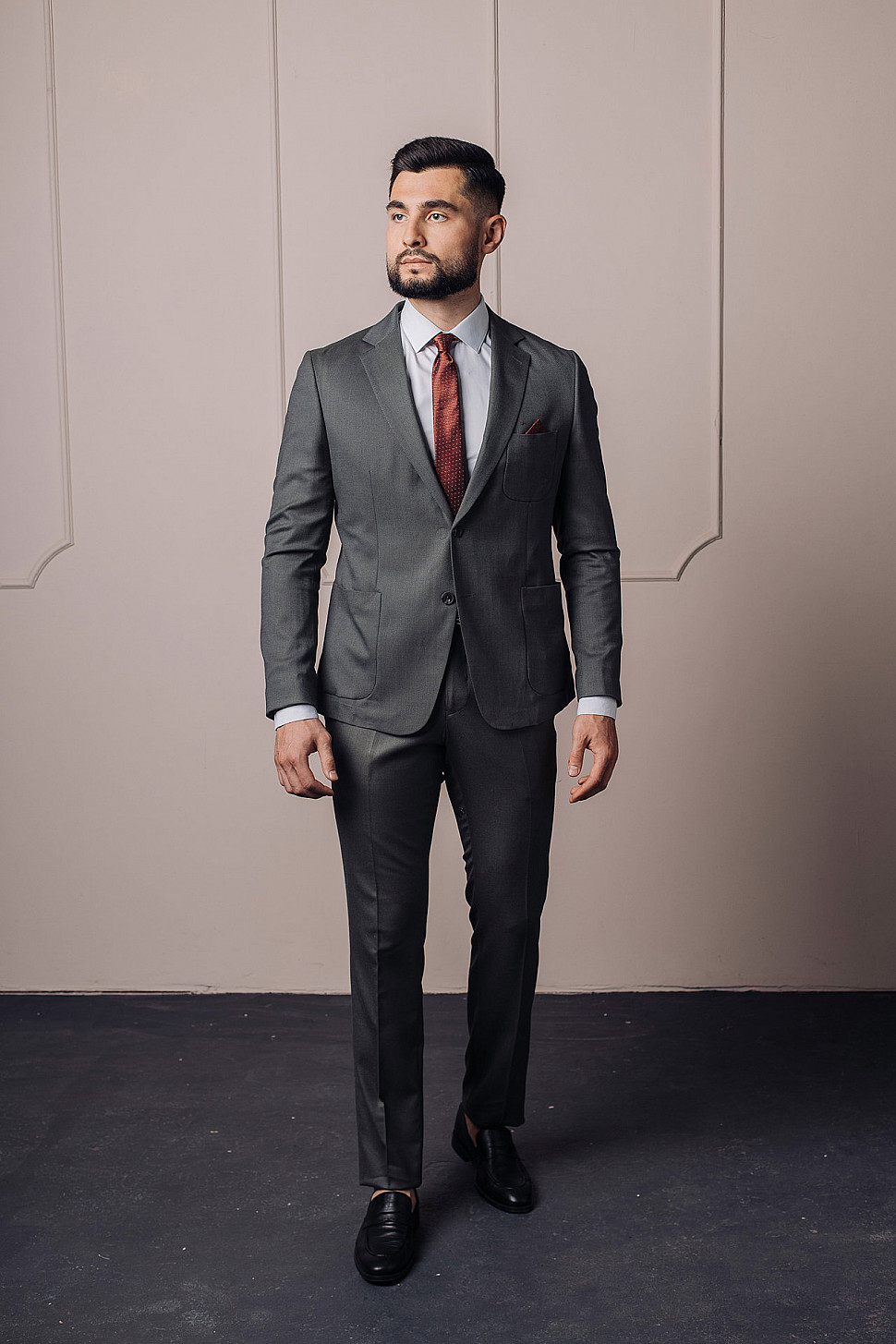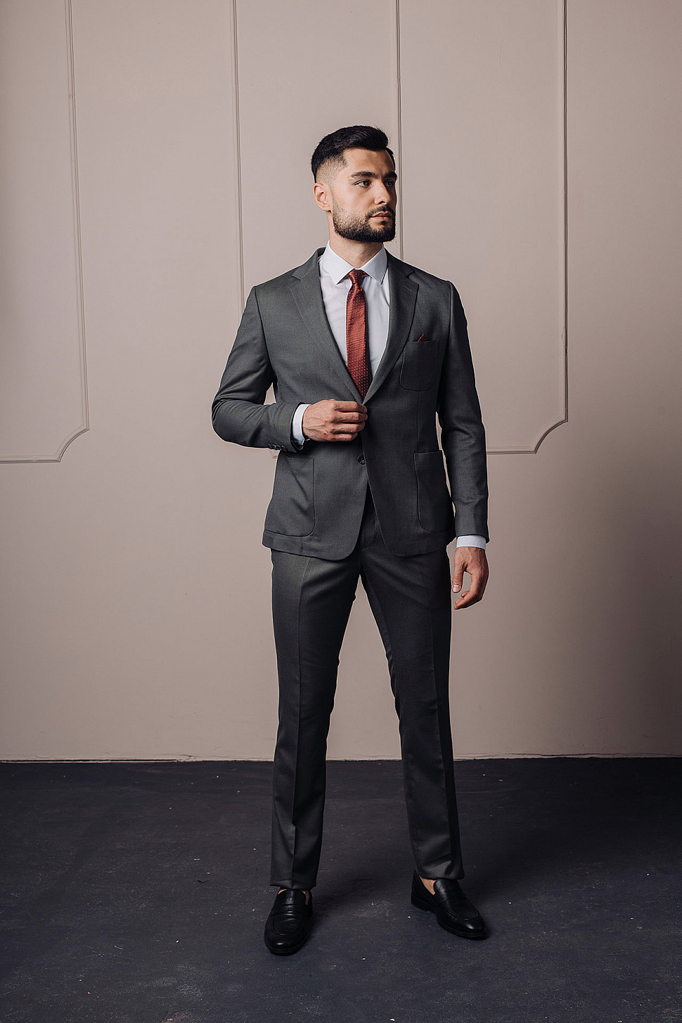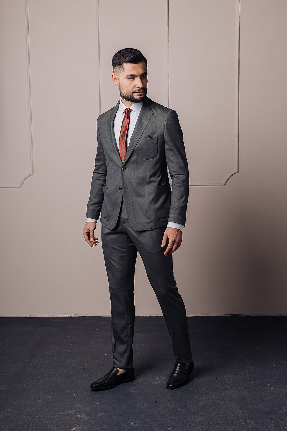 Мужской костюм двойка графитового цвета с накладными карманами