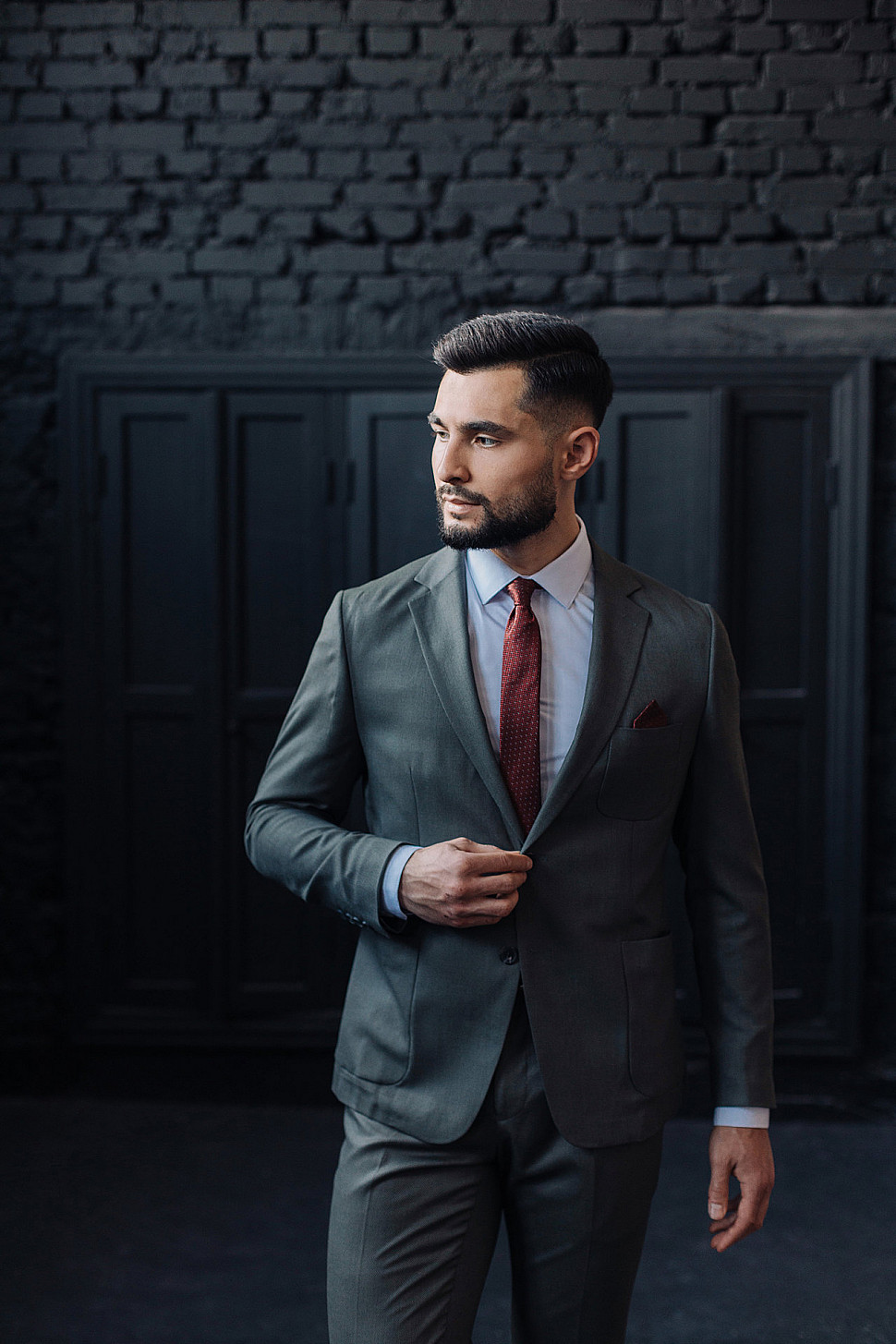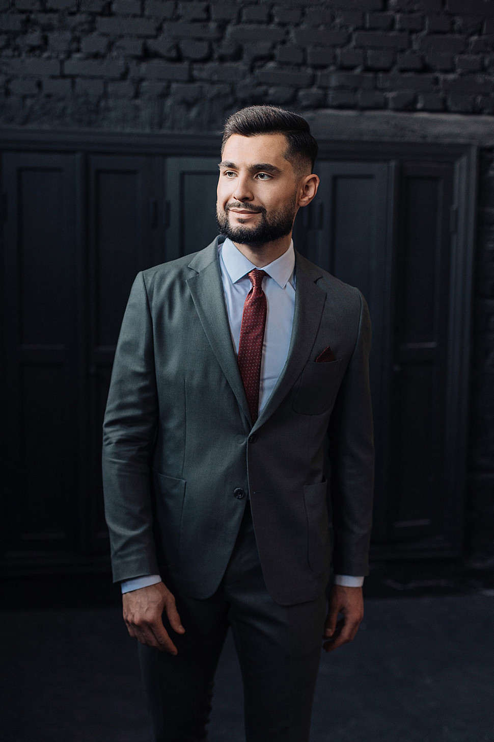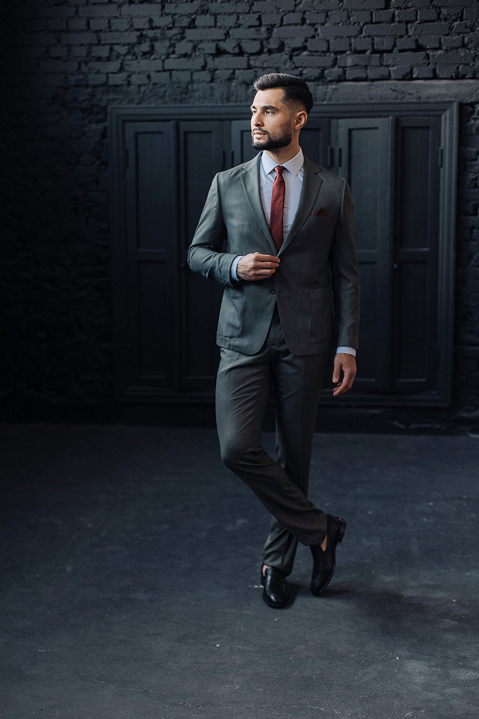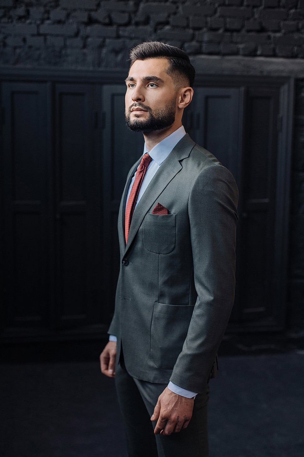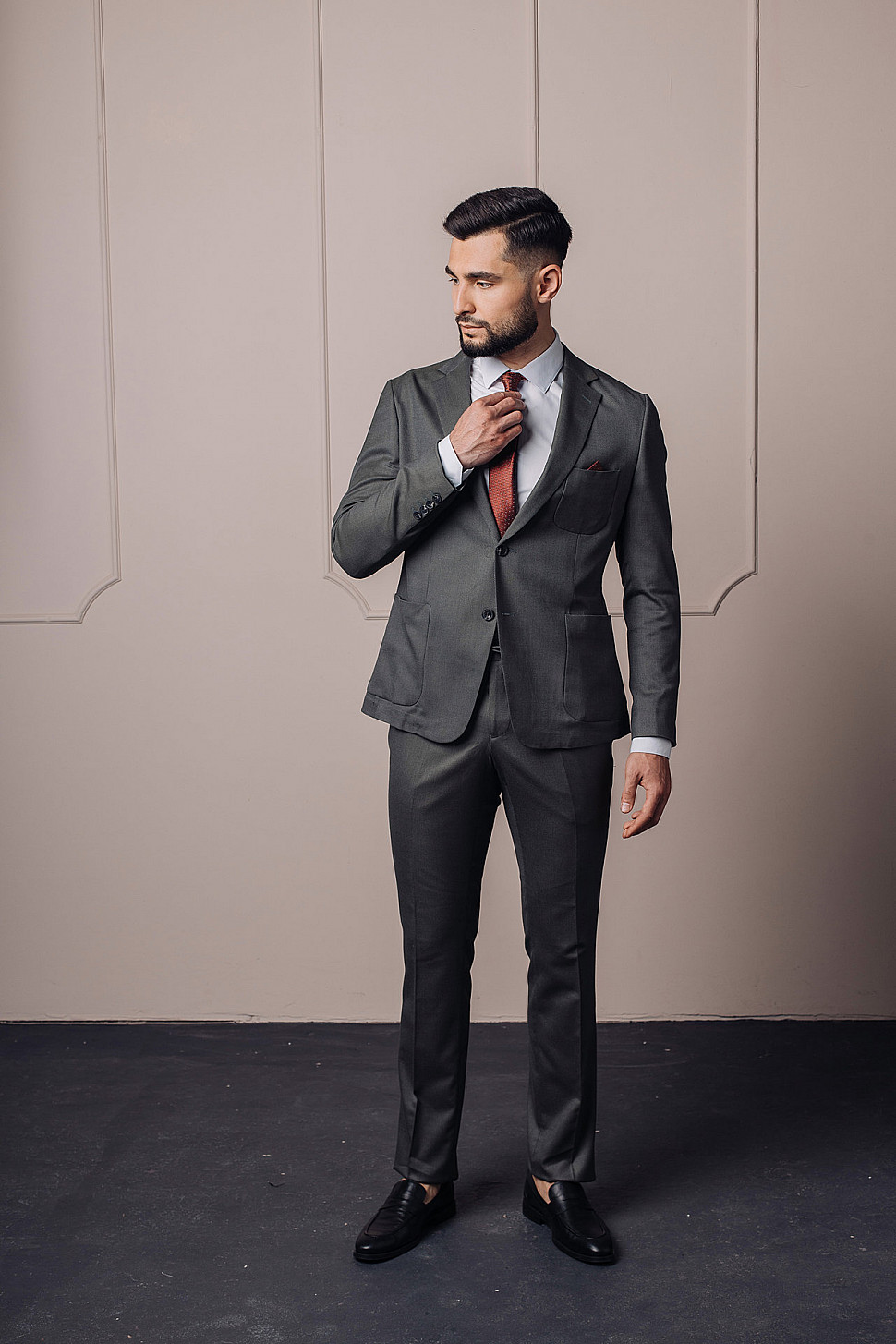 Мужской костюм двойка графитового цвета с накладными карманами