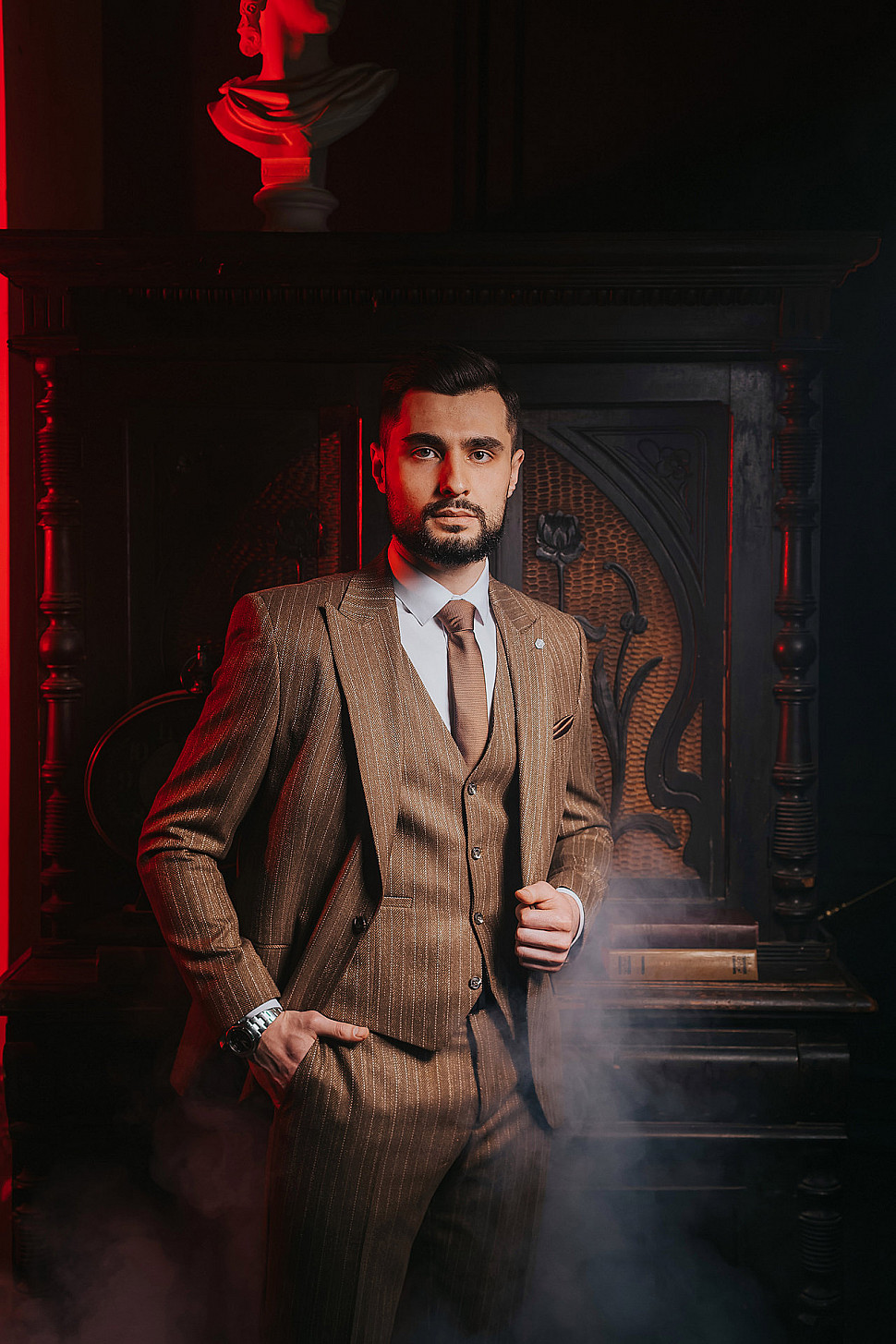 Мужской костюм двойка коричневого цвета в полоску двубортный