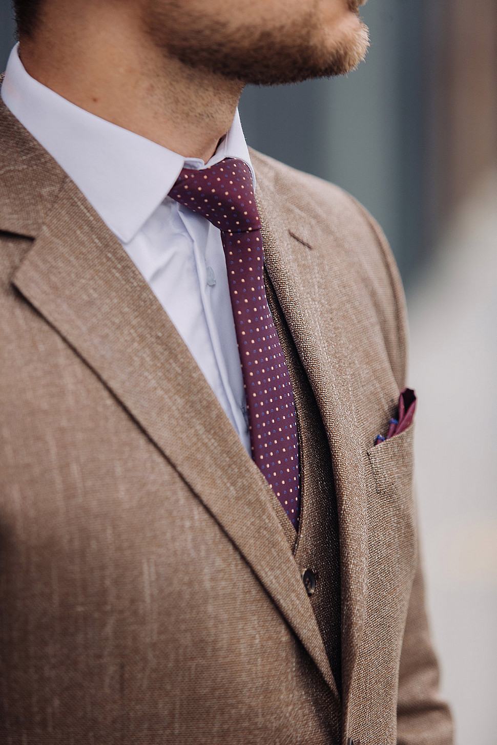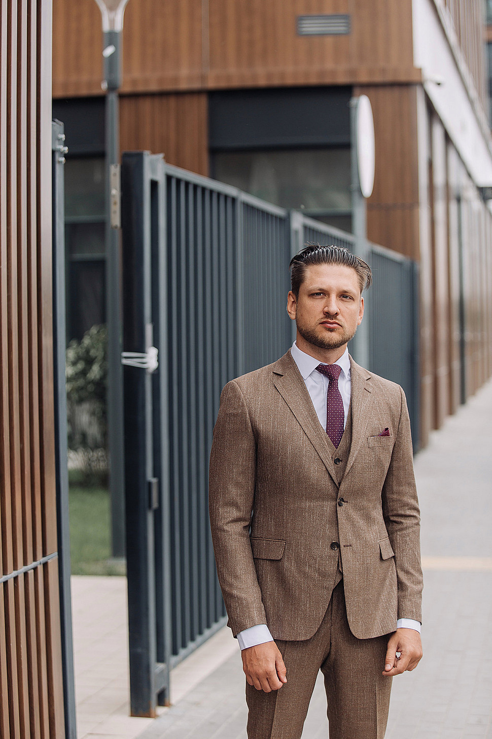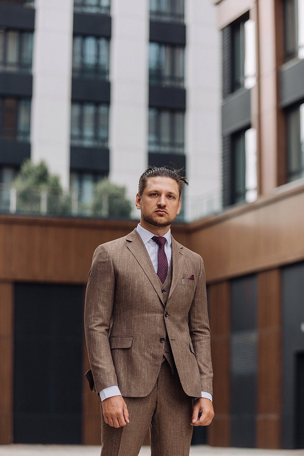 Костюм бежевый тройка с коричневым галстуком