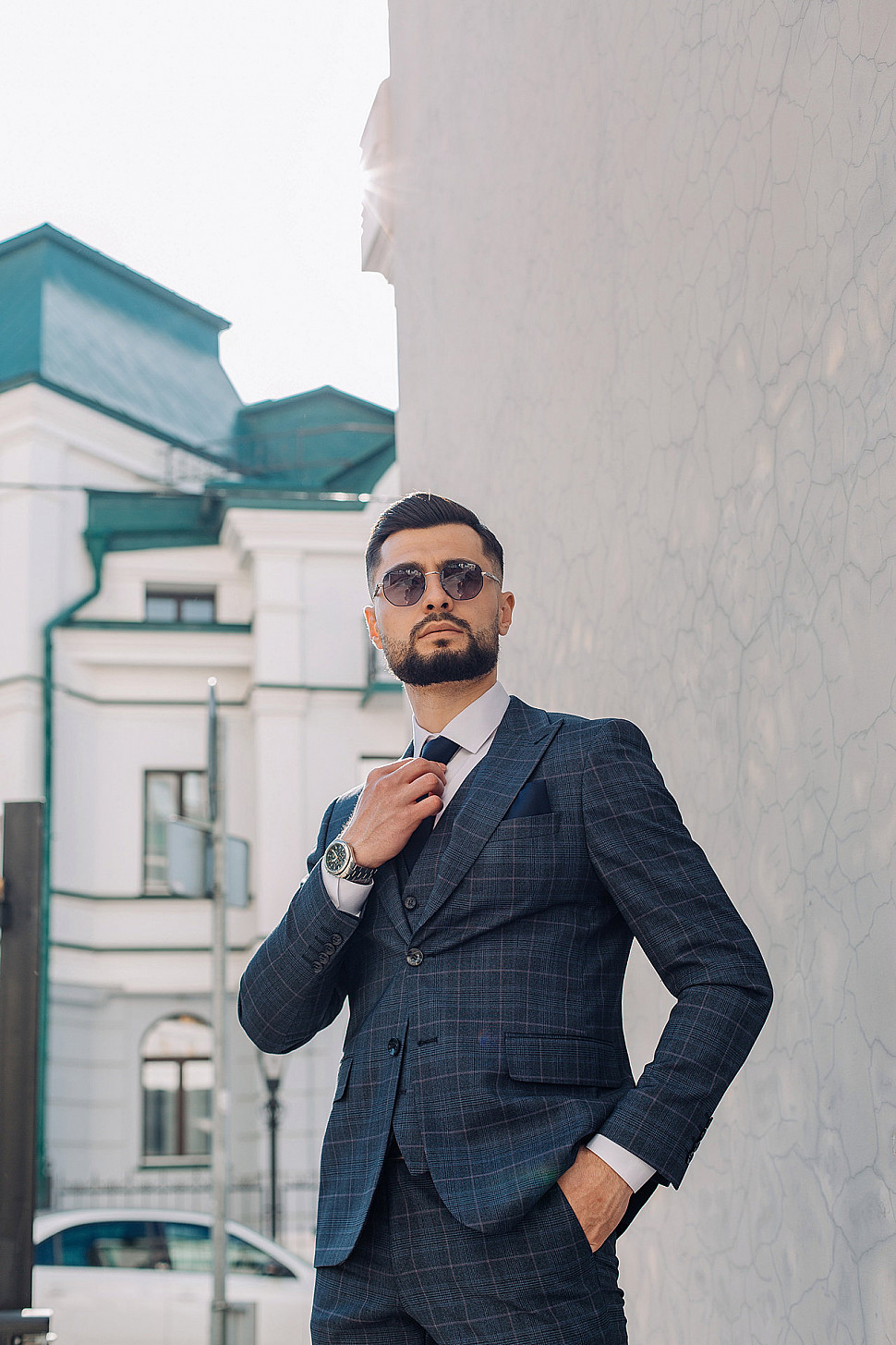 Мужской костюм тройка синего цвета в зеленую клетку