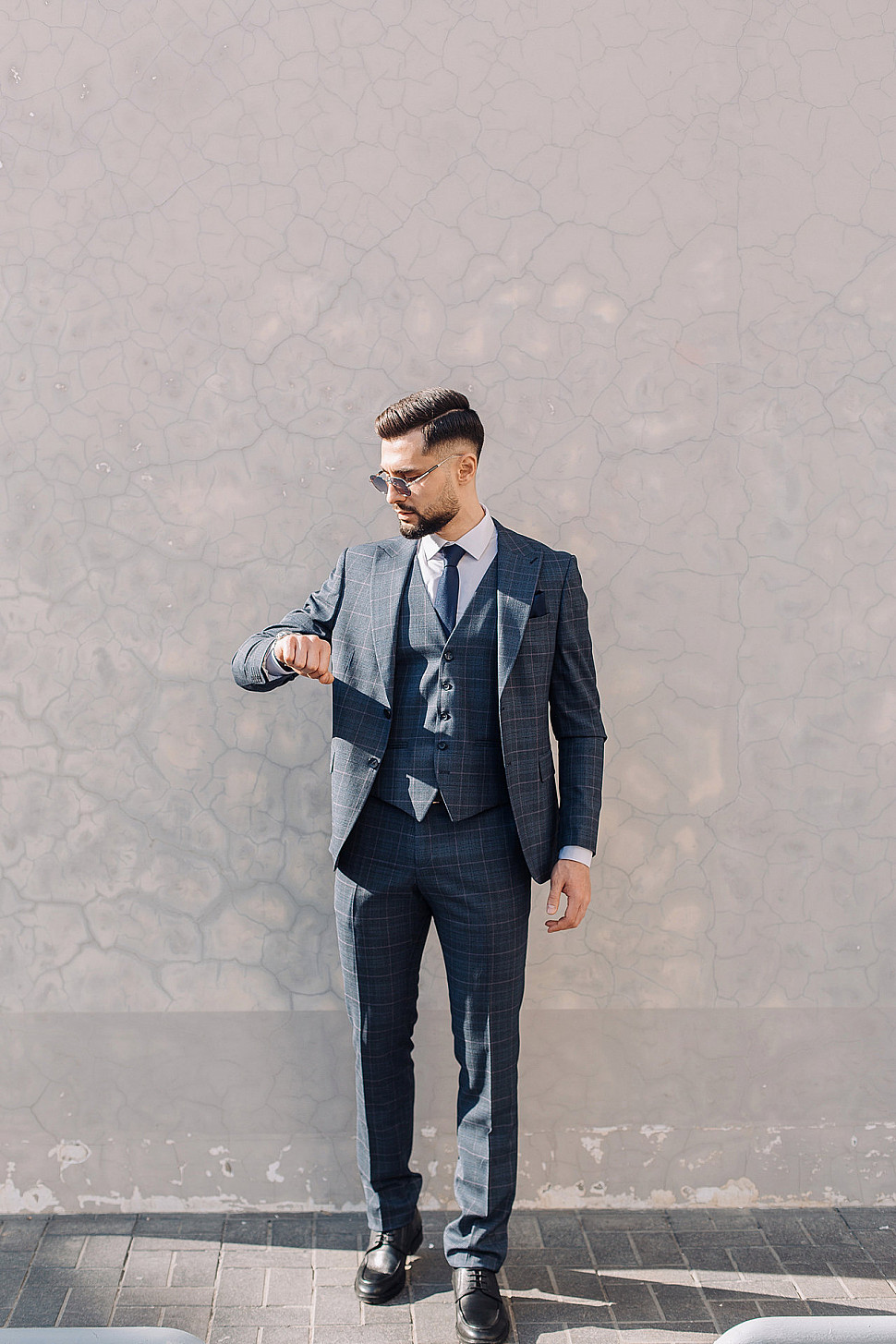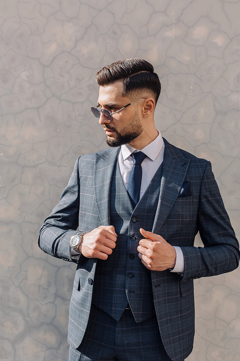 Мужской костюм тройка темно-синего цвета текстурный в клетку