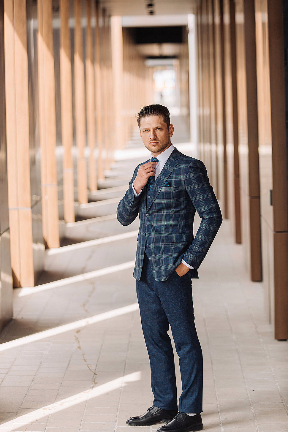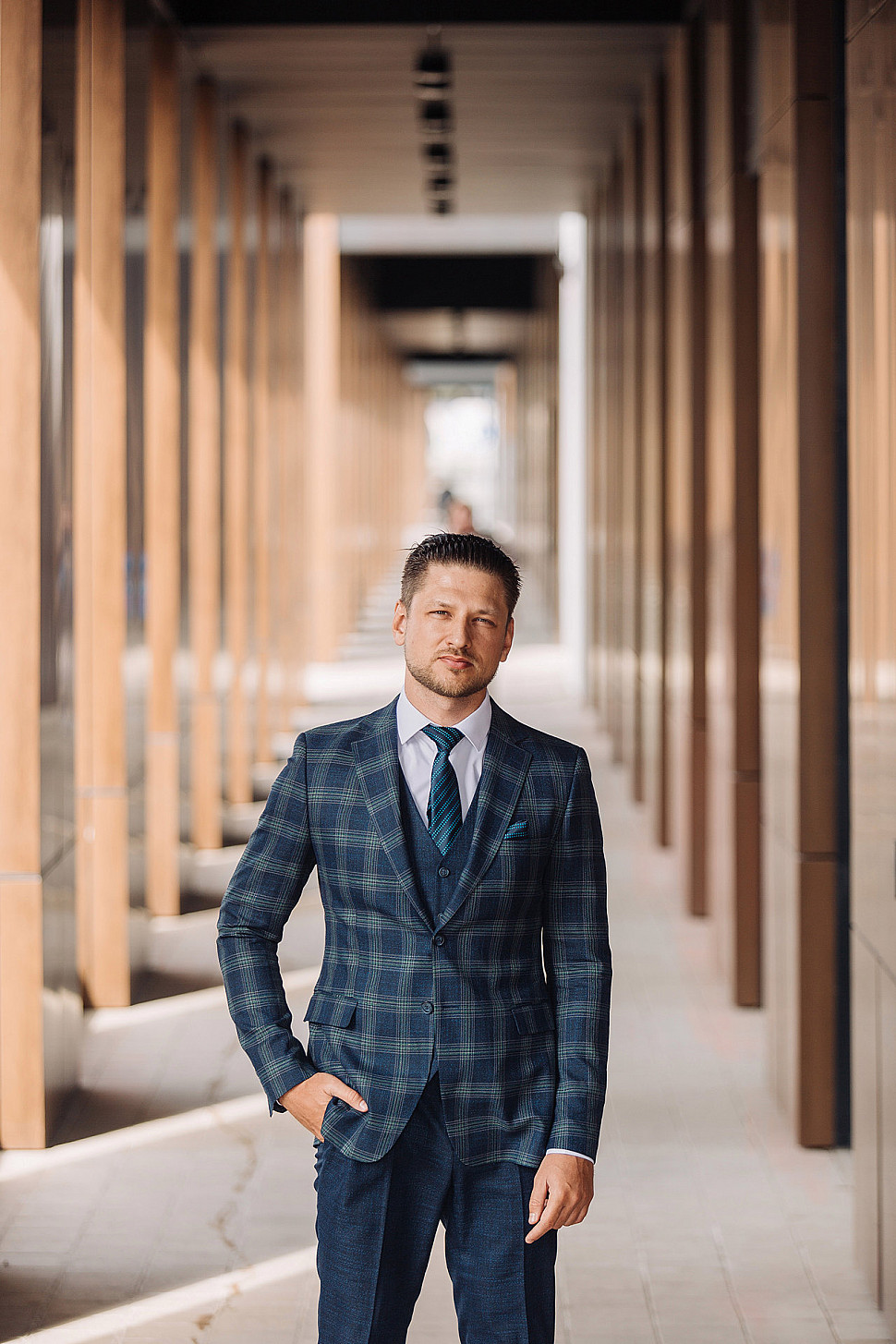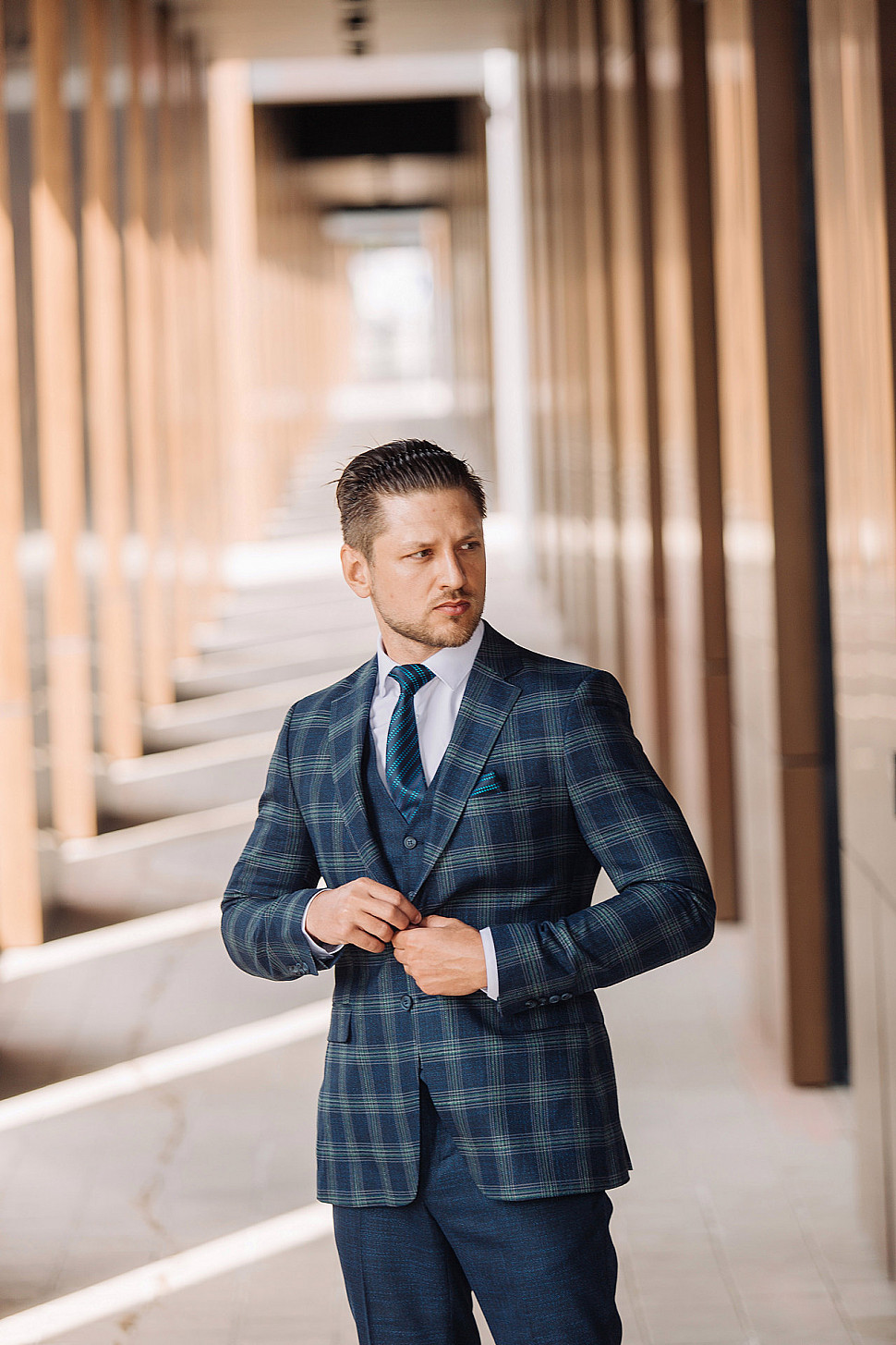 Мужской костюм тройка синего цвета в зеленую клетку