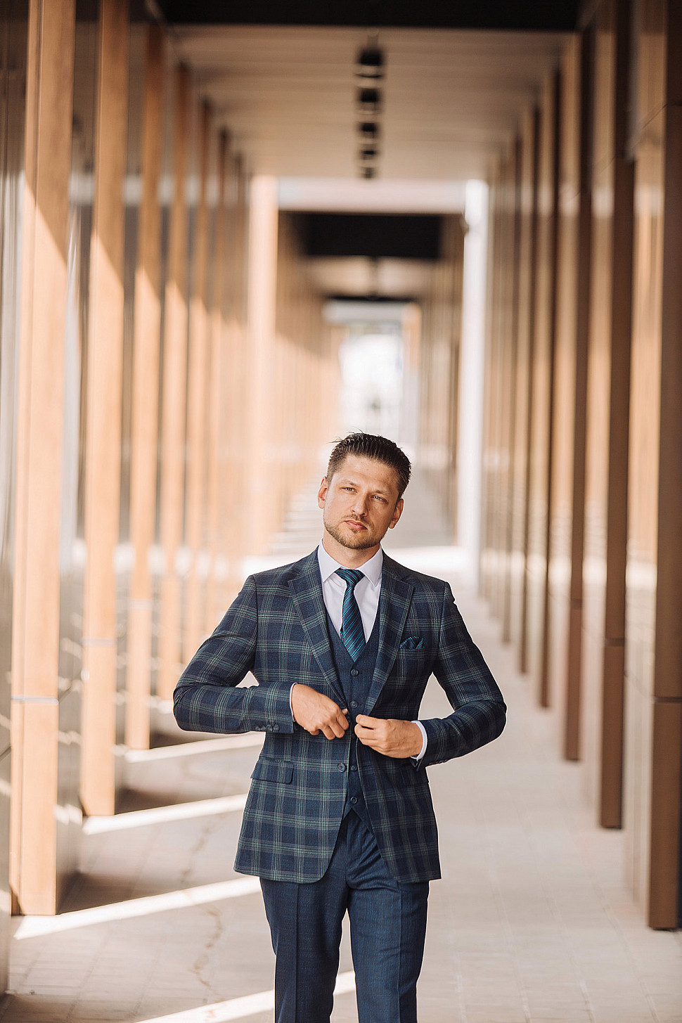 Костюм светло-коричневый двойка в клетку, повседневный и классический образ