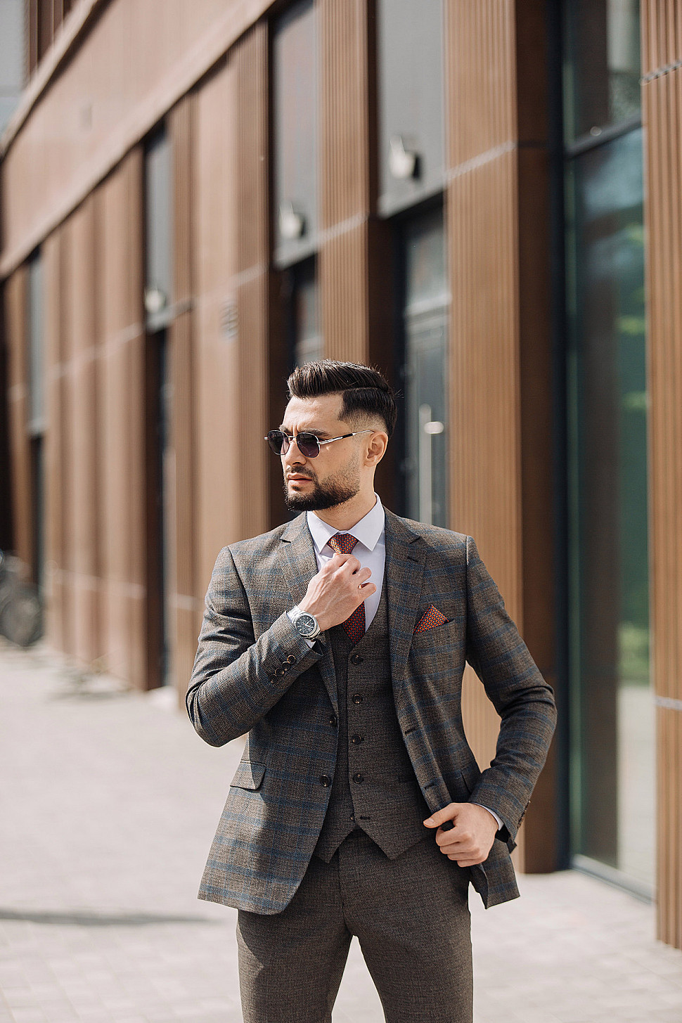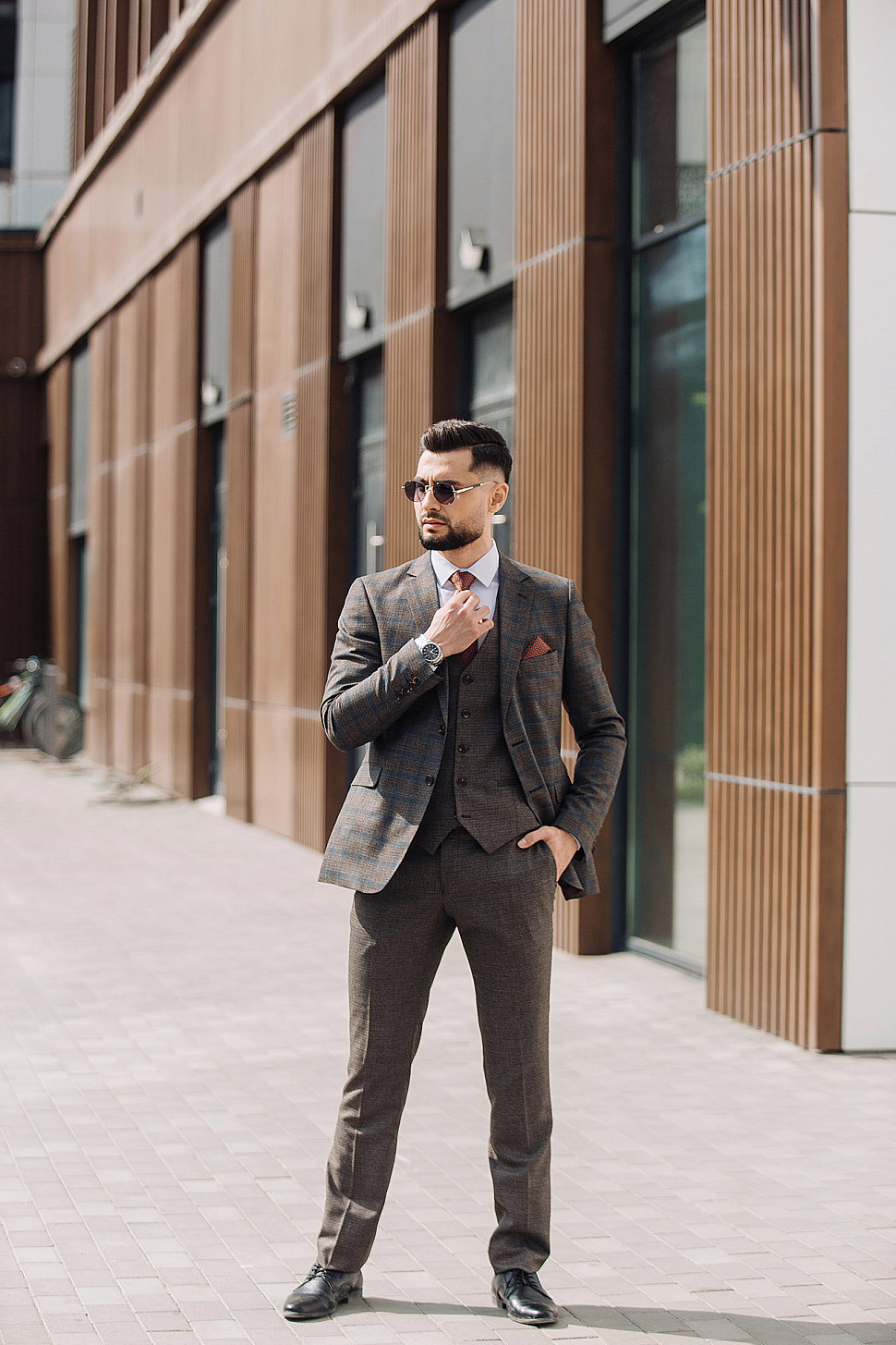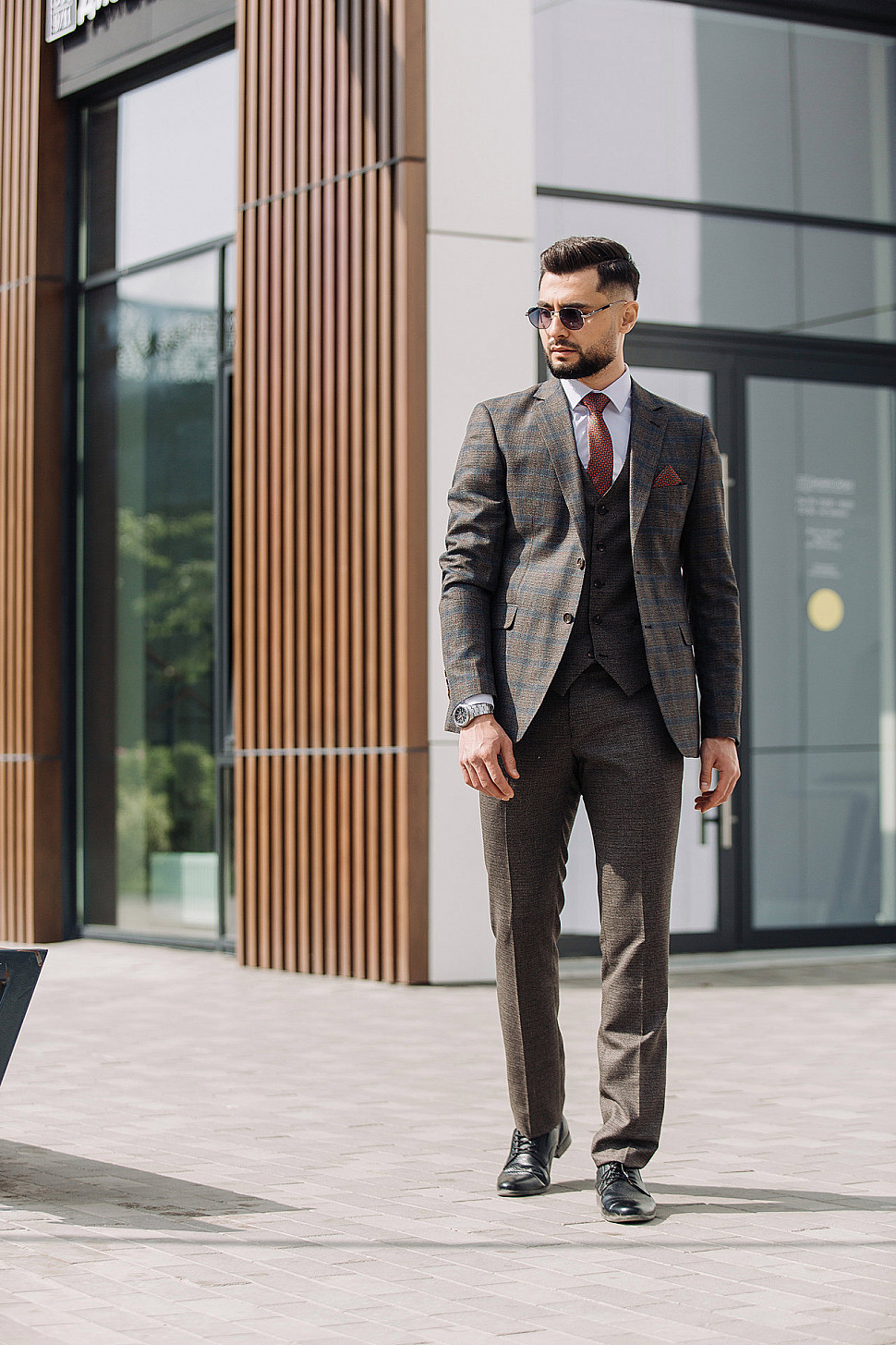 Костюм светло-коричневый двойка в клетку, повседневный и классический образ