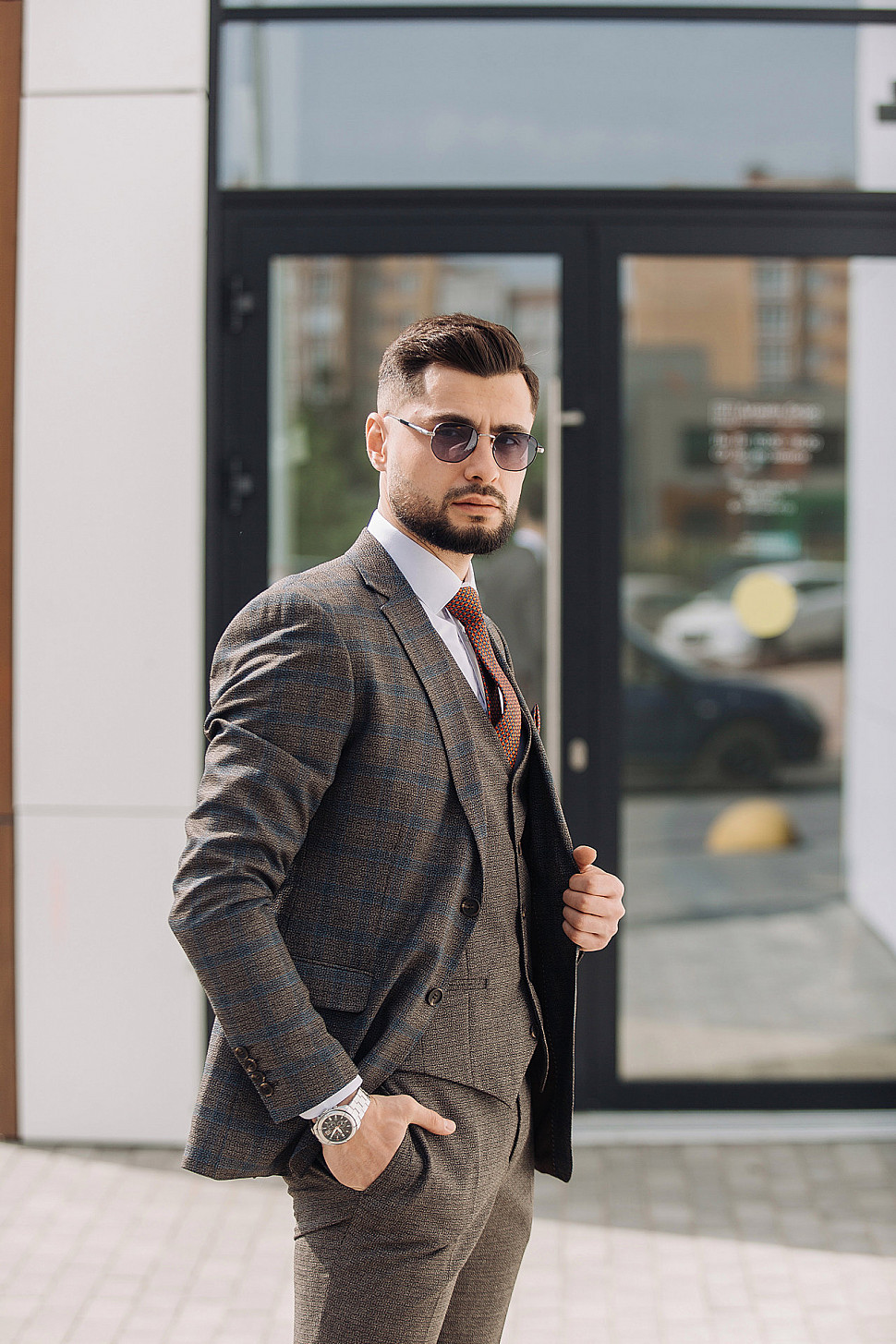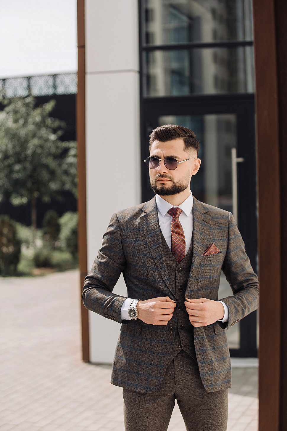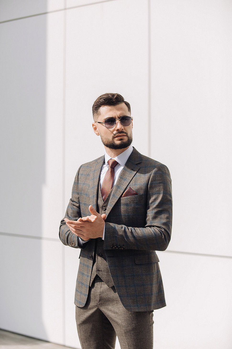 Костюм светло-коричневый двойка в клетку, повседневный и классический образ