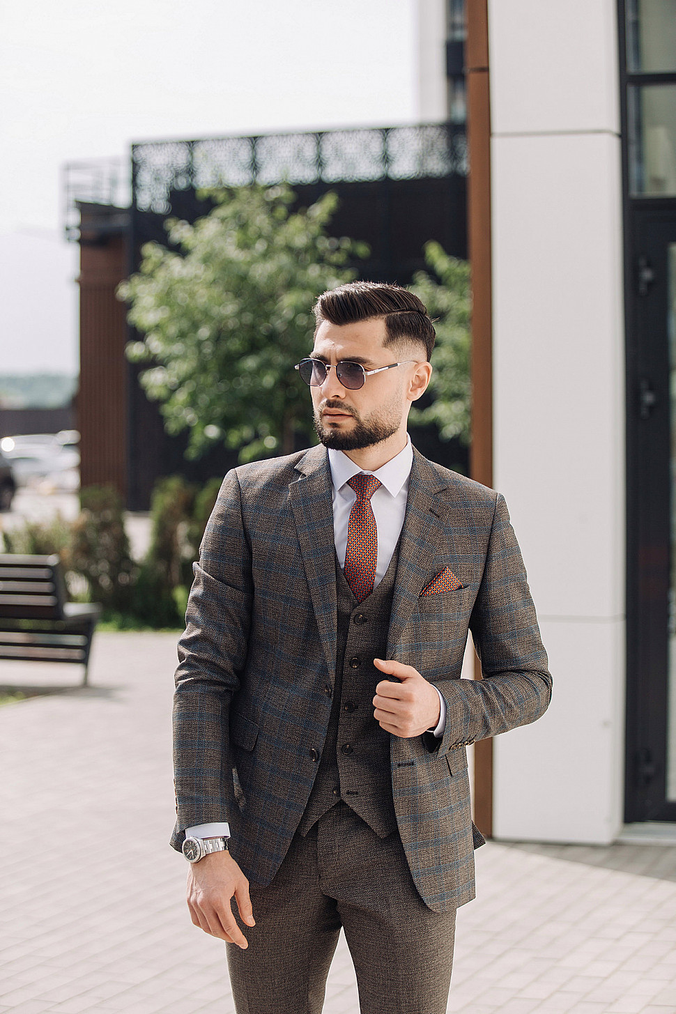 Мужской костюм тройка коричневого цвета в синюю клетку