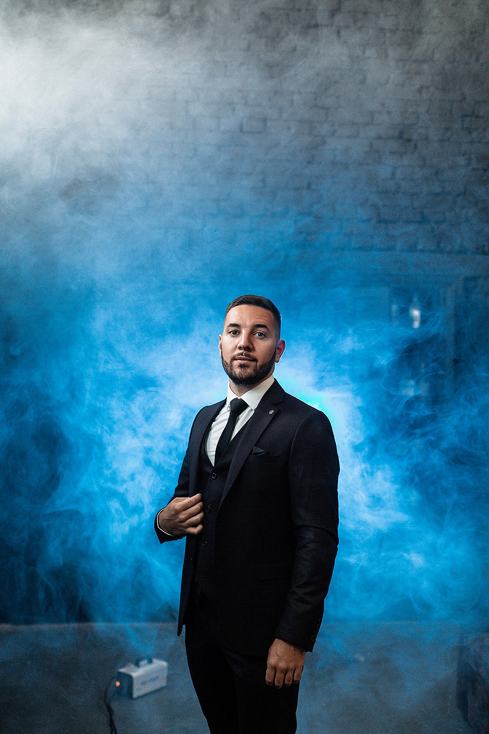 Мужской костюм двойка серый двубортный с золотыми пуговицами