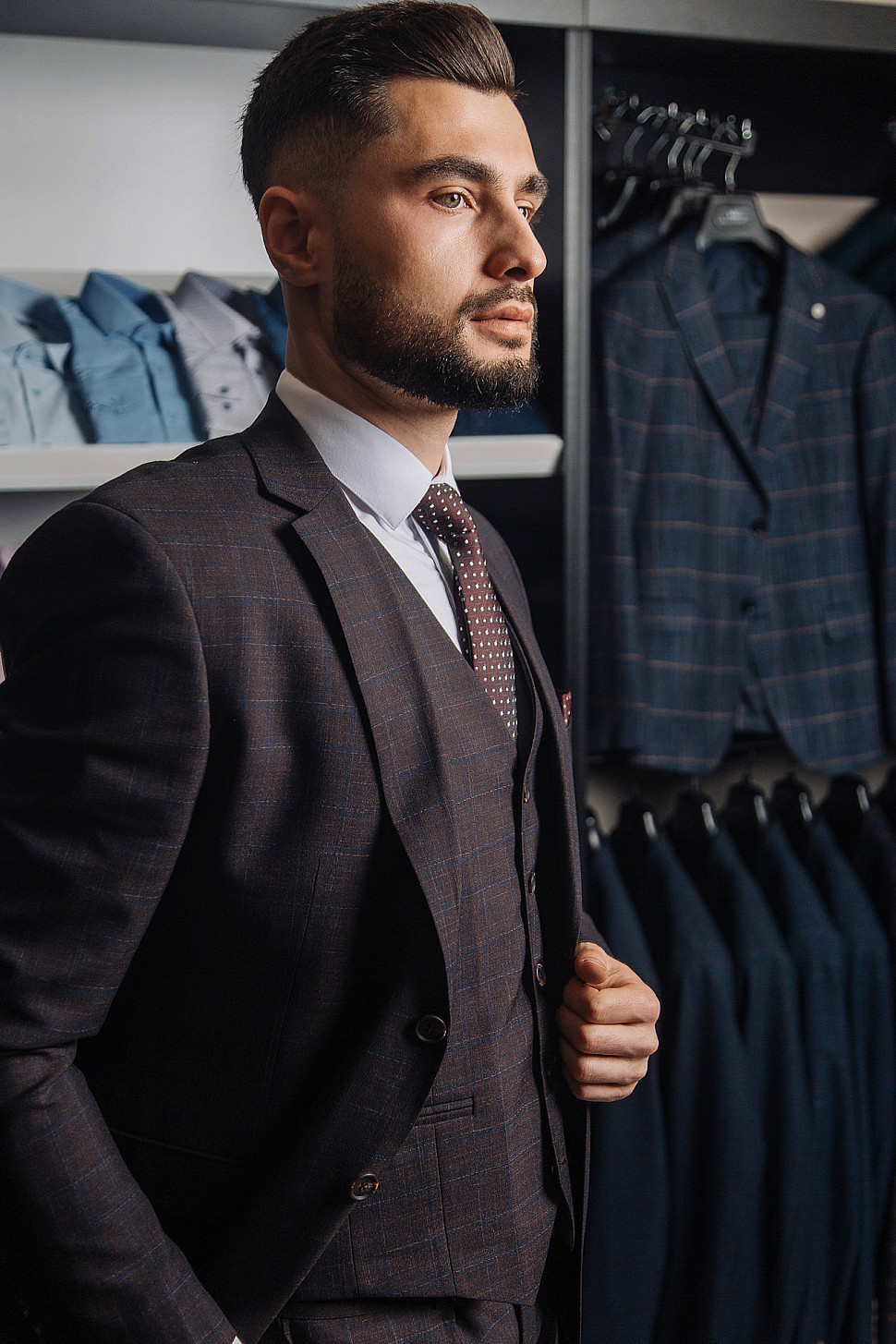Мужской костюм тройка коричневого цвета фактурный в синюю клетку