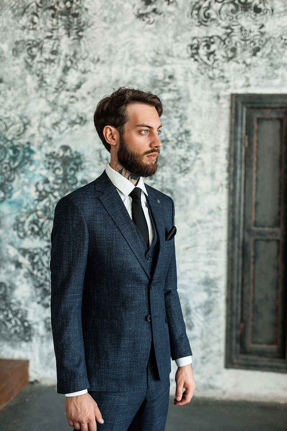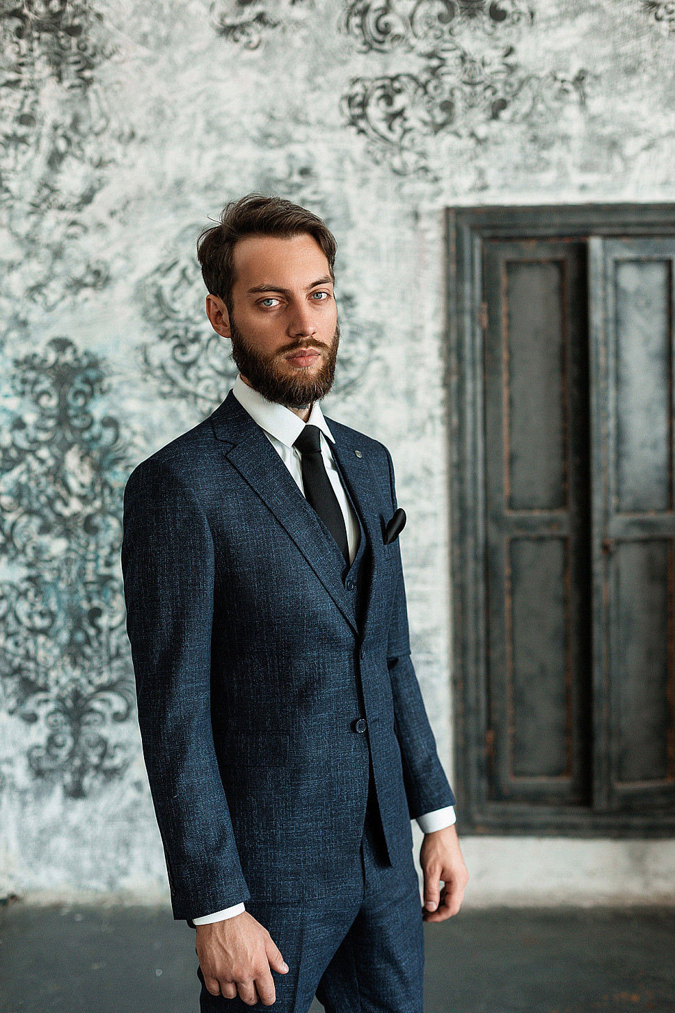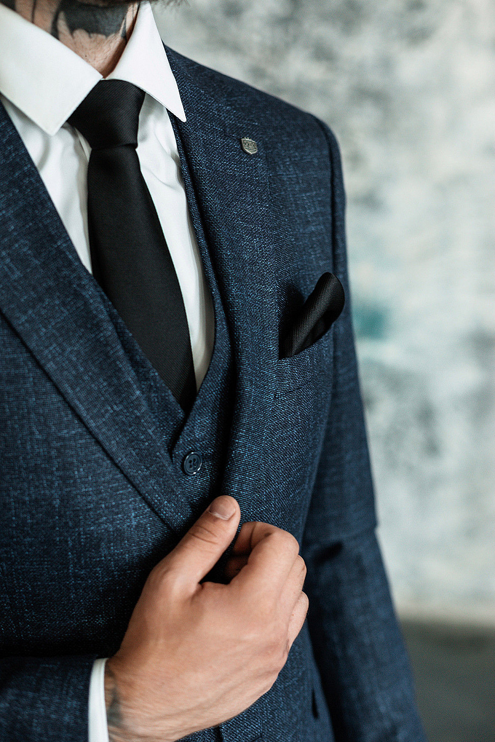 Мужской костюм тройка темно-синего цвета текстурный