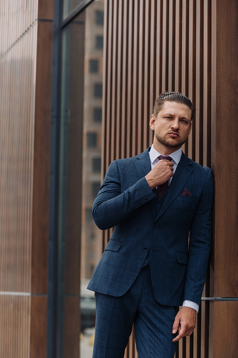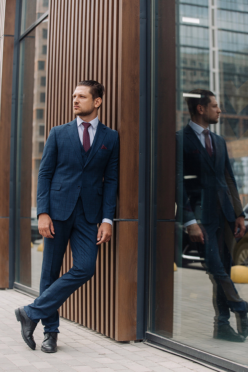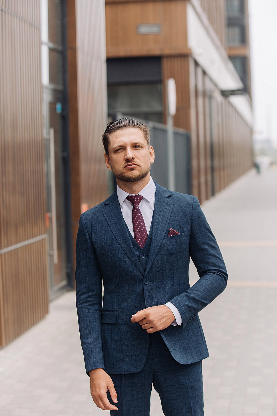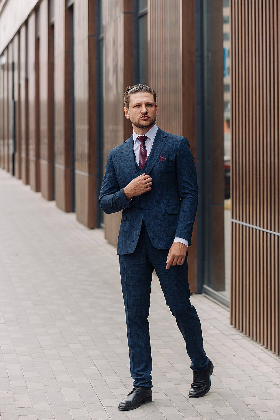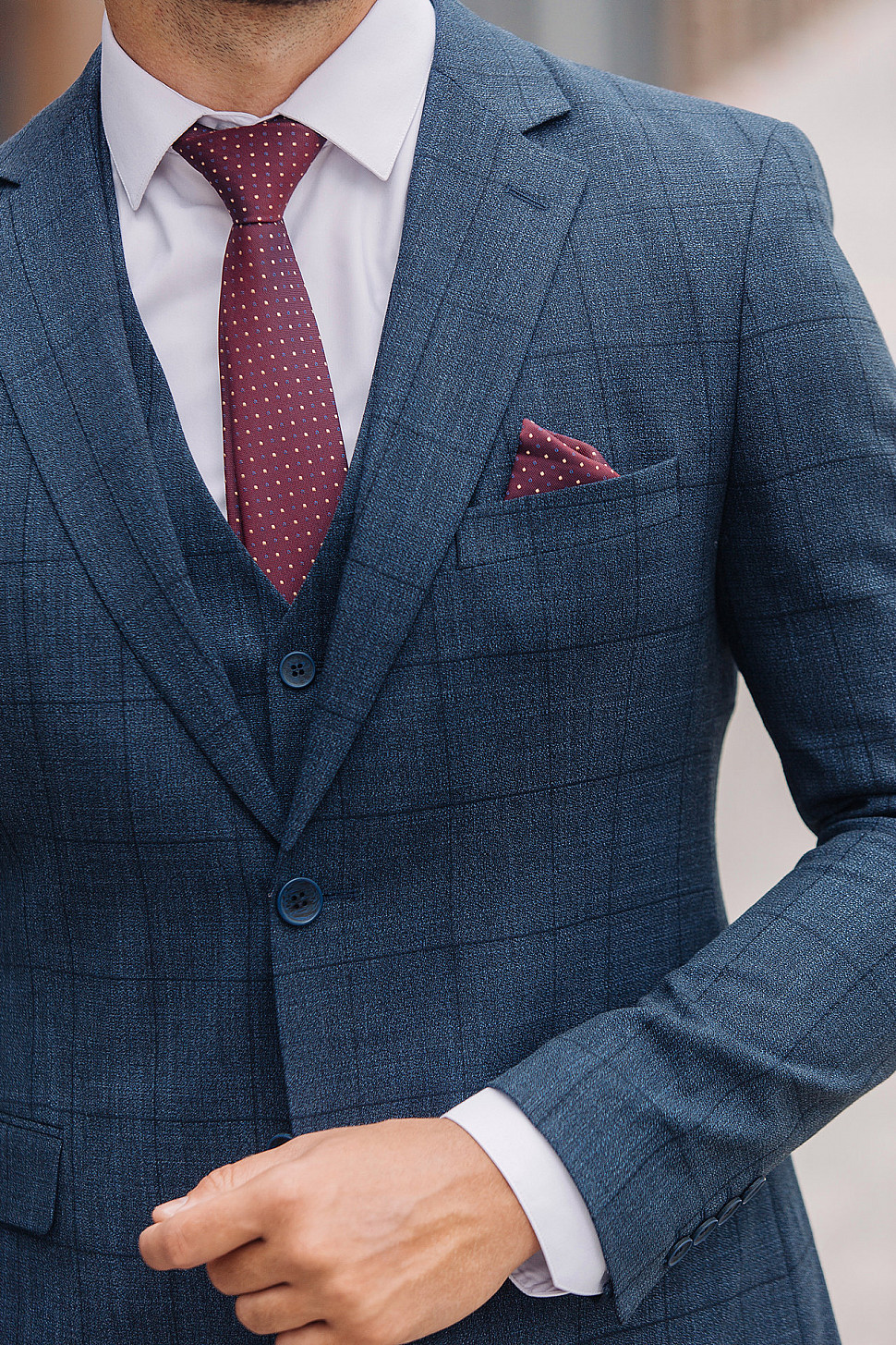Мужской костюм тройка темно-синего цвета текстурный в клетку