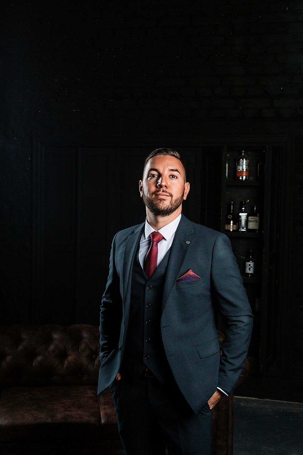 Мужской костюм тройка бордового цвета фактурный