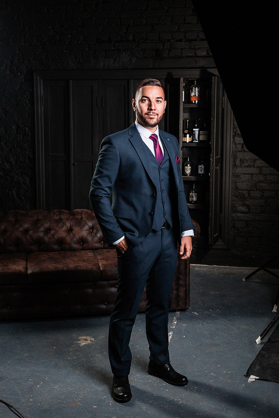 Мужской костюм тройка черного цвета и сноуборд